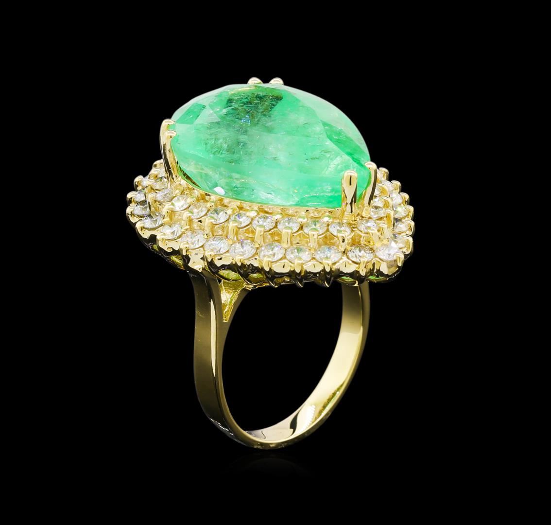 One electronically tested 14KT yellow gold lady's cast fashion ring with a double basket halo with a bright polish finish. The featured lady's ring has a shank measuring 3.03 millimeters wide. Identified with markings of "K14". Condition is new, good workmanship. Containing: One prong set pear modified brilliant cut natural emerald, measuring 21.11 x 15.01 x 10.99mm, exact weight 17.66ct., clarity is moderately included, type III, medium, very slightly grayish, green color, (GIA G 5/3), cut is good. Transmitting light somewhat diffusely, transparent to translucent. Naturally occurring internal & external characteristics are present. Clarity enhanced. Graded loose prior to setting in the GIA Laboratory, Report # 2175501599.Twenty-Seven prong set round brilliant cut diamonds, measuring 2.40 - 2.30 x 1.46mm (depth est.) approximate total weight of 27 Stones = 1.35ct. Graded in the setting. Clarity: SI-1 to SI-2. Color: H - I. Cut Good Twenty-Six prong set round brilliant cut diamonds, measuring 2.00 - 1.95 x 1.23mm (depth est.) approximate total weight of 26 Stones = 0.78ct. Graded in the setting. Clarity: VS to SI-2. Color: H - I. Cut Good. Total Weight of Colored Stones 17.66ct. Total Weight of Diamonds 2.13ct. Total Weight of Ring 13.80gm. GAS Appraised at $32,420.00.