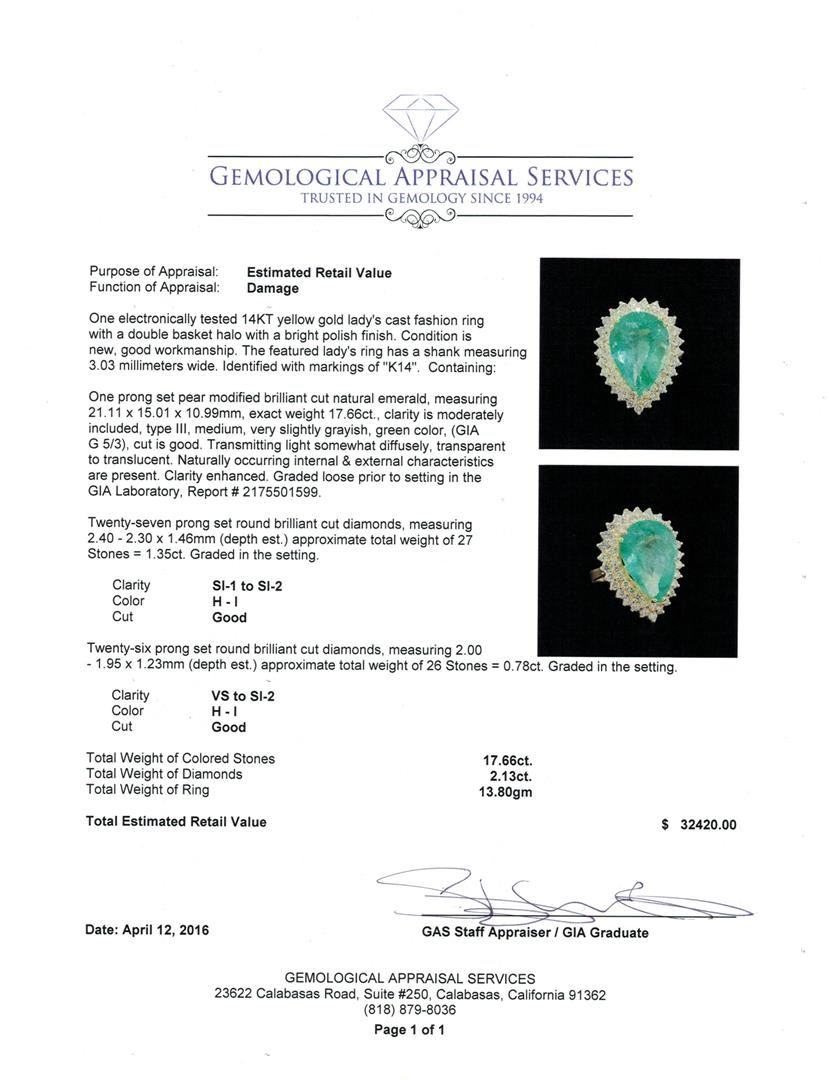 One electronically tested 14KT yellow gold lady's cast fashion ring with a double basket halo with a bright polish finish. The featured lady's ring has a shank measuring 3.03 millimeters wide. Identified with markings of "K14". Condition is new, good workmanship. Containing: One prong set pear modified brilliant cut natural emerald, measuring 21.11 x 15.01 x 10.99mm, exact weight 17.66ct., clarity is moderately included, type III, medium, very slightly grayish, green color, (GIA G 5/3), cut is good. Transmitting light somewhat diffusely, transparent to translucent. Naturally occurring internal & external characteristics are present. Clarity enhanced. Graded loose prior to setting in the GIA Laboratory, Report # 2175501599.Twenty-Seven prong set round brilliant cut diamonds, measuring 2.40 - 2.30 x 1.46mm (depth est.) approximate total weight of 27 Stones = 1.35ct. Graded in the setting. Clarity: SI-1 to SI-2. Color: H - I. Cut Good Twenty-Six prong set round brilliant cut diamonds, measuring 2.00 - 1.95 x 1.23mm (depth est.) approximate total weight of 26 Stones = 0.78ct. Graded in the setting. Clarity: VS to SI-2. Color: H - I. Cut Good. Total Weight of Colored Stones 17.66ct. Total Weight of Diamonds 2.13ct. Total Weight of Ring 13.80gm. GAS Appraised at $32,420.00.