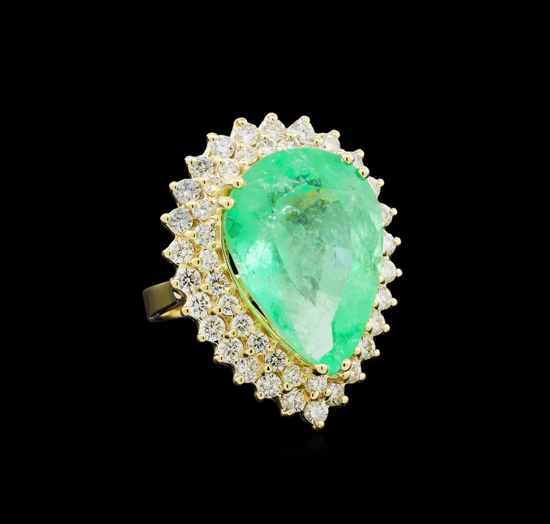 One electronically tested 14KT yellow gold lady's cast fashion ring with a double basket halo with a bright polish finish. The featured lady's ring has a shank measuring 3.03 millimeters wide. Identified with markings of "K14". Condition is new, good workmanship. Containing: One prong set pear modified brilliant cut natural emerald, measuring 21.11 x 15.01 x 10.99mm, exact weight 17.66ct., clarity is moderately included, type III, medium, very slightly grayish, green color, (GIA G 5/3), cut is good. Transmitting light somewhat diffusely, transparent to translucent. Naturally occurring internal & external characteristics are present. Clarity enhanced. Graded loose prior to setting in the GIA Laboratory, Report # 2175501599.Twenty-Seven prong set round brilliant cut diamonds, measuring 2.40 - 2.30 x 1.46mm (depth est.) approximate total weight of 27 Stones = 1.35ct. Graded in the setting. Clarity: SI-1 to SI-2. Color: H - I. Cut Good Twenty-Six prong set round brilliant cut diamonds, measuring 2.00 - 1.95 x 1.23mm (depth est.) approximate total weight of 26 Stones = 0.78ct. Graded in the setting. Clarity: VS to SI-2. Color: H - I. Cut Good. Total Weight of Colored Stones 17.66ct. Total Weight of Diamonds 2.13ct. Total Weight of Ring 13.80gm. GAS Appraised.