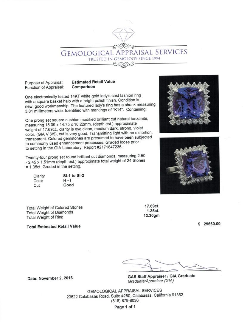 One electronically tested 14KT white gold lady's cast fashion ring with a square basket halo with a bright polish finish. The featured lady's ring has a shank measuring 3.81 millimeters wide. Identified with markings of 'K14'. Condition is new, good workmanship. Containing: One prong set square cushion modified brilliant cut natural tanzanite, measuring 15.09 x 14.75 x 10.22mm, (depth est.) approximate weight of 17.69ct., clarity is eye clean, medium dark, strong, violet color, (GIA V 6/5), cut is very good. Transmitting light with no distortion, transparent. Colored gemstones are presumed to have been subjected to commonly used enhancement processes. Graded loose prior to setting in the GIA Laboratory, Report #2171847236. Twenty-Four prong set round brilliant cut diamonds, measuring 2.50 - 2.45 x 1.51mm (depth est.) approximate total weight of 24 Stones = 1.35ct. Graded in the setting. Clarity SI-1 to SI-2. Color: H - I Cut Good. Total Weight of Colored Stones 17.69ct.. Total Weight of Diamonds 1.35ct.. Total Weight of Ring 13.30gm. GAS Appraised at $29,660.00.