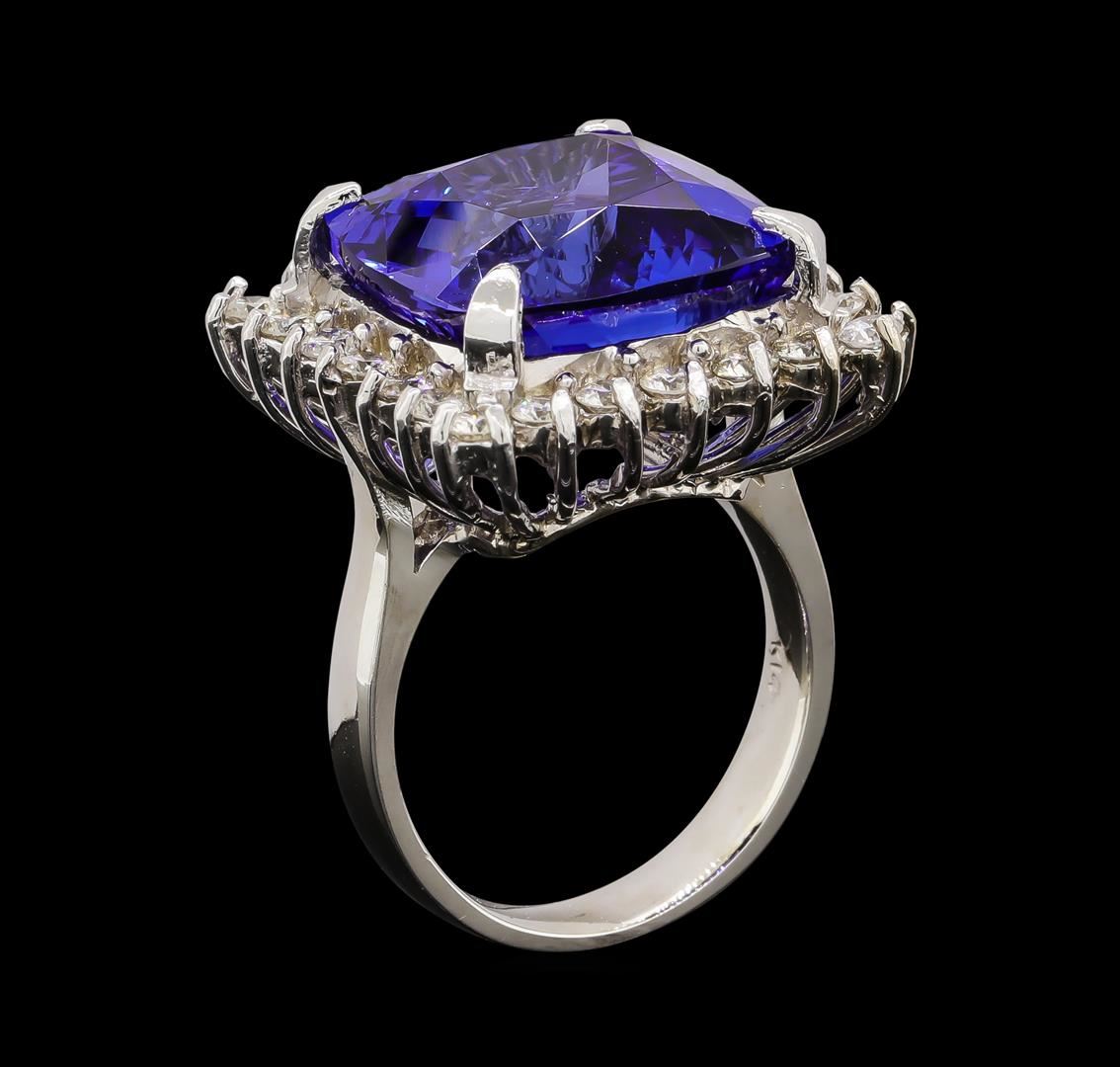 One electronically tested 14KT white gold lady's cast fashion ring with a square basket halo with a bright polish finish. The featured lady's ring has a shank measuring 3.81 millimeters wide. Identified with markings of 'K14'. Condition is new, good workmanship. Containing: One prong set square cushion modified brilliant cut natural tanzanite, measuring 15.09 x 14.75 x 10.22mm, (depth est.) approximate weight of 17.69ct., clarity is eye clean, medium dark, strong, violet color, (GIA V 6/5), cut is very good. Transmitting light with no distortion, transparent. Colored gemstones are presumed to have been subjected to commonly used enhancement processes. Graded loose prior to setting in the GIA Laboratory, Report #2171847236. Twenty-Four prong set round brilliant cut diamonds, measuring 2.50 - 2.45 x 1.51mm (depth est.) approximate total weight of 24 Stones = 1.35ct. Graded in the setting. Clarity SI-1 to SI-2. Color: H - I Cut Good. Total Weight of Colored Stones 17.69ct.. Total Weight of Diamonds 1.35ct.. Total Weight of Ring 13.30gm. GAS Appraised at $29,660.00.