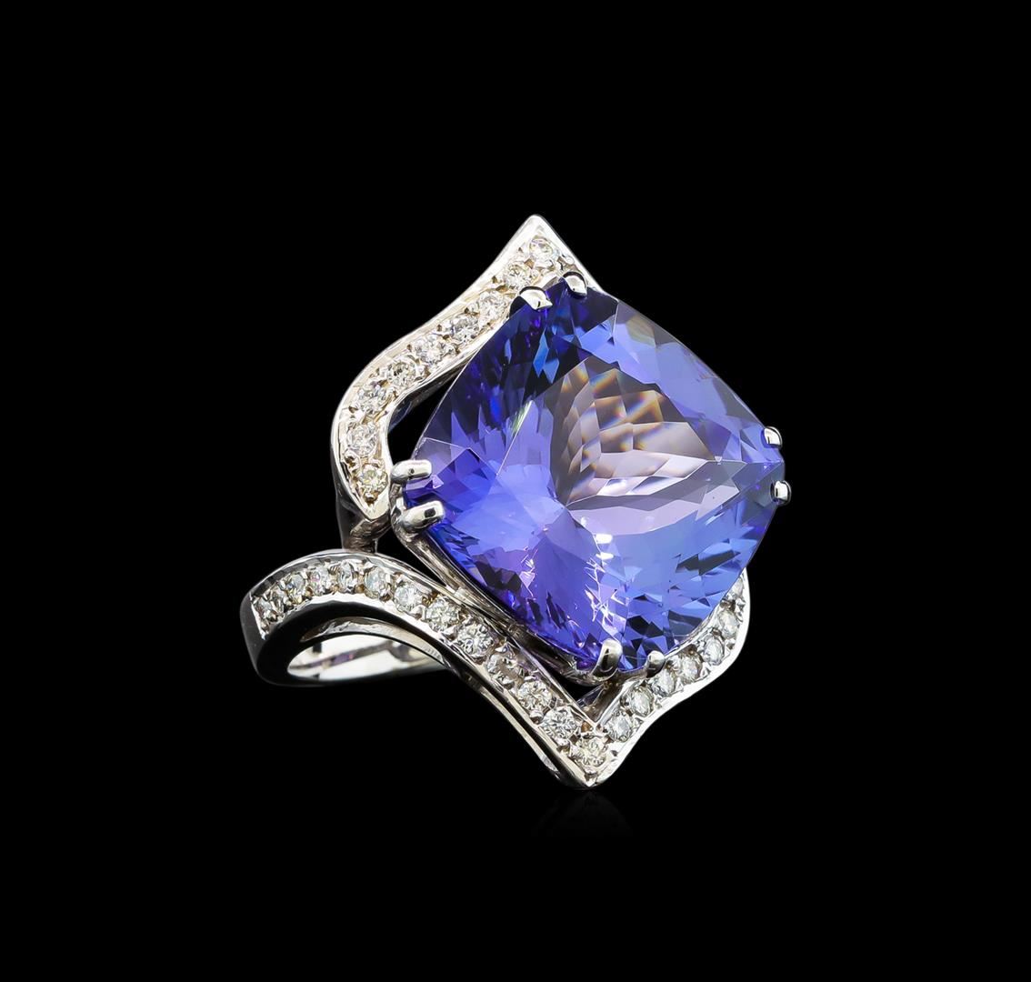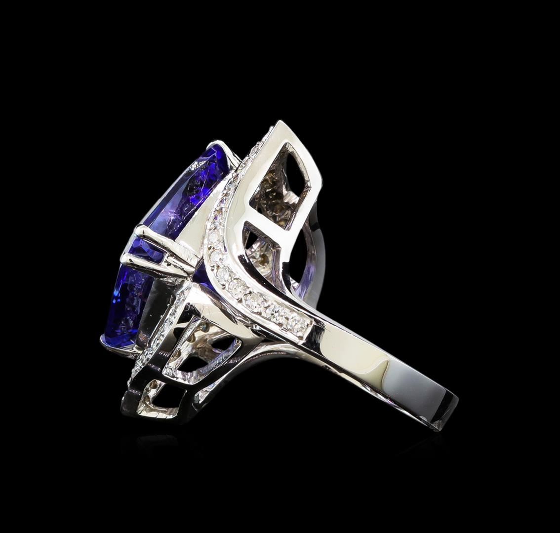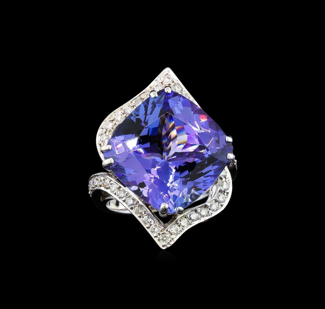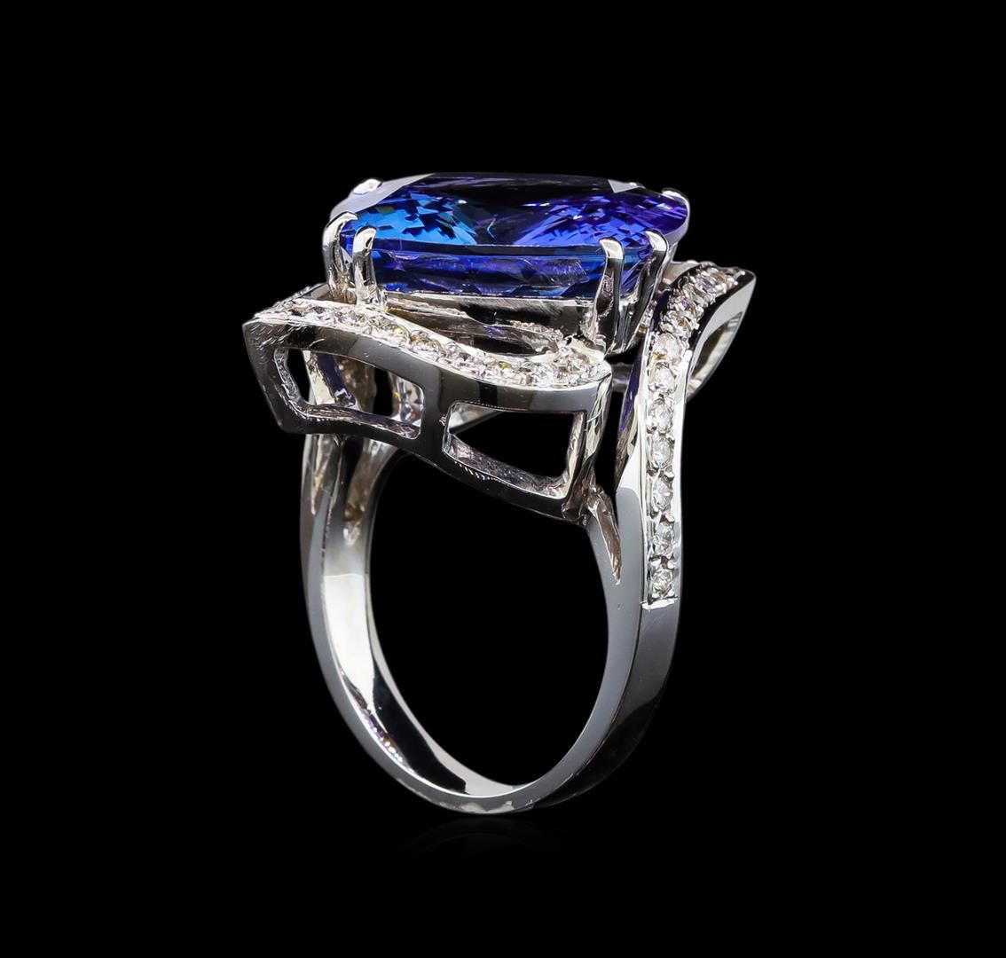 One electronically tested 14KT white gold lady's cast fashion ring with a bypass halo with a bright polish finish. The featured lady's ring has a shank measuring 3.39 millimeters wide. Identified with markings of 'K14'. Condition is new, good workmanship. Containing: One prong set square cushion modified brilliant cut natural tanzanite, measuring 16.38 x 16.35 x 9.22mm, (depth est.) approximate weight of 17.73ct., clarity is eye clean, medium, moderately strong, violetish blue color, (GIA vB 5/4), cut is very good. Transmitting light with no distortion, transparent. Colored gemstones are presumed to have been subjected to commonly used enhancement processes. Graded loose prior to setting in the GIA Laboratory, Report #6173668757. Forty-Two bead set round brilliant cut diamonds, measuring 1.60 - 1.50 x 0.95mm (depth est.) approximate total weight of 42 Stones = 0.58ct. Graded in the setting. Clarity SI-1 to I-1. Color: H - I Cut Good. Total Weight of Colored Stones 17.73ct.. Total Weight of Diamonds 0.58ct.. Total Weight of Ring 12.30gm. GAS Appraised at $28,545.00.