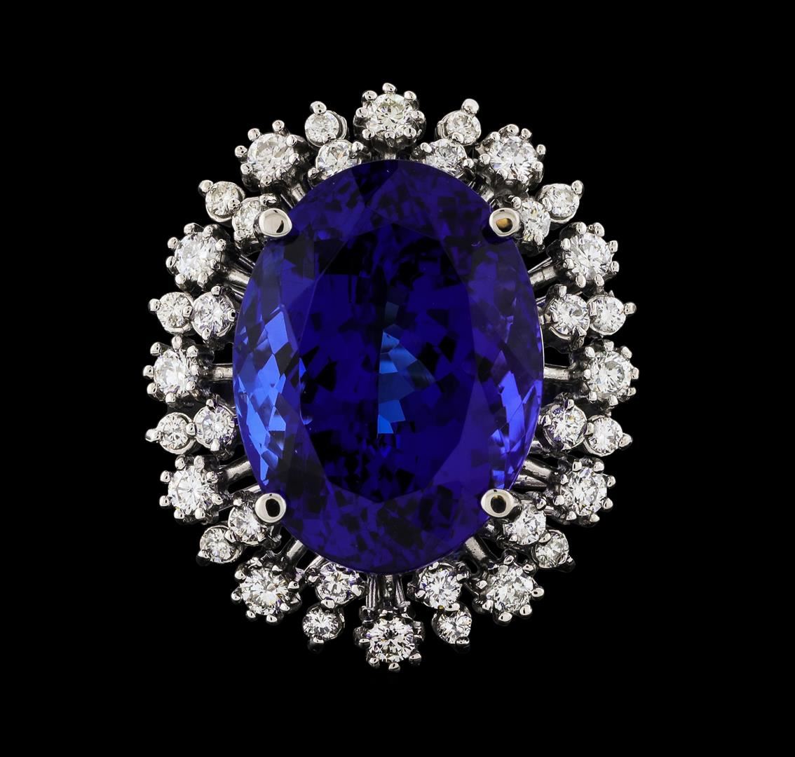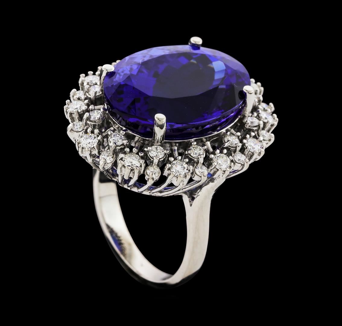 One electronically tested 14KT white gold lady's cast fashion ring with a double basket halo with a bright polish finish. The featured lady's ring has a shank measuring 2.55 millimeters wide. Identified with markings of 'K14'. Condition is new, good workmanship. Containing: One prong set oval modified brilliant cut natural tanzanite, measuring 18.03 x 13.48 x 10.74mm, (depth est.) approximate weight of 18.78ct., clarity is eye clean, dark, strong, violetish blue color, (GIA vB 7/5), cut is very good. Transmitting light with no distortion, transparent. Colored gemstones are presumed to have been subjected to commonly used enhancement processes. Graded loose prior to setting in the GIA Laboratory, Report #2173847725. Twelve prong set round brilliant cut diamonds, measuring 2.20 - 2.10 x 1.29mm (depth est.) approximate total weight of 12 Stones = 0.44ct. Graded in the setting. Clarity SI-1 to I-1. Color: H - I Cut Good Twenty-Four prong set round brilliant cut diamonds, measuring 1.80 - 1.60 x 1.05mm (depth est.) approximate total weight of 24 Stones = 0.45ct. Graded in the setting. Clarity SI-1 to SI-2. Color: H - I Cut Good. Total Weight of Colored Stones 18.78ct.. Total Weight of Diamonds 0.89ct.. Total Weight of Ring 10.70gm. GAS Appraised at $27,040.00.