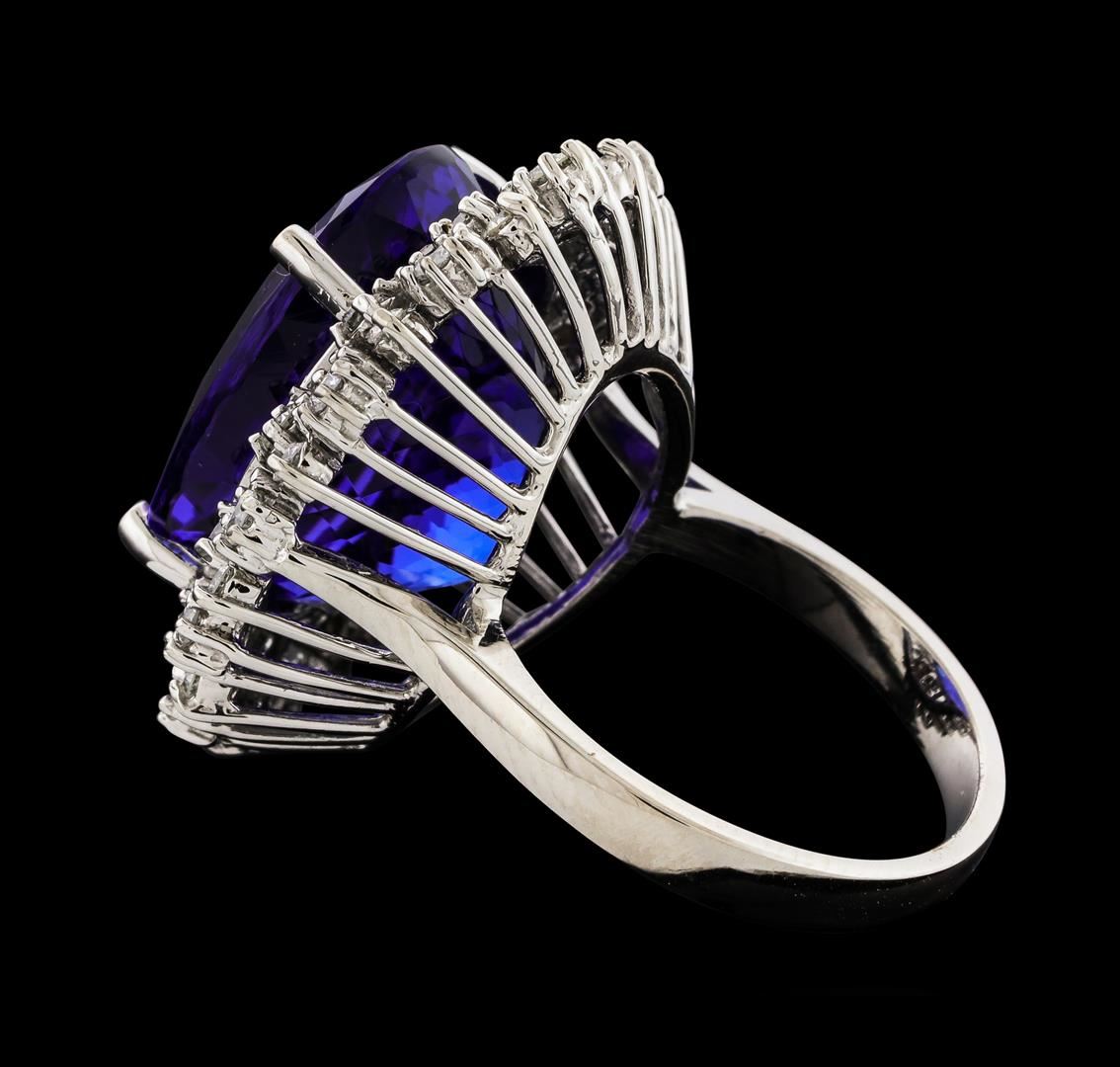 One electronically tested 14KT white gold lady's cast fashion ring with a double basket halo with a bright polish finish. The featured lady's ring has a shank measuring 2.55 millimeters wide. Identified with markings of 'K14'. Condition is new, good workmanship. Containing: One prong set oval modified brilliant cut natural tanzanite, measuring 18.03 x 13.48 x 10.74mm, (depth est.) approximate weight of 18.78ct., clarity is eye clean, dark, strong, violetish blue color, (GIA vB 7/5), cut is very good. Transmitting light with no distortion, transparent. Colored gemstones are presumed to have been subjected to commonly used enhancement processes. Graded loose prior to setting in the GIA Laboratory, Report #2173847725. Twelve prong set round brilliant cut diamonds, measuring 2.20 - 2.10 x 1.29mm (depth est.) approximate total weight of 12 Stones = 0.44ct. Graded in the setting. Clarity SI-1 to I-1. Color: H - I Cut Good Twenty-Four prong set round brilliant cut diamonds, measuring 1.80 - 1.60 x 1.05mm (depth est.) approximate total weight of 24 Stones = 0.45ct. Graded in the setting. Clarity SI-1 to SI-2. Color: H - I Cut Good. Total Weight of Colored Stones 18.78ct.. Total Weight of Diamonds 0.89ct.. Total Weight of Ring 10.70gm. GAS Appraised at $27,040.00.
