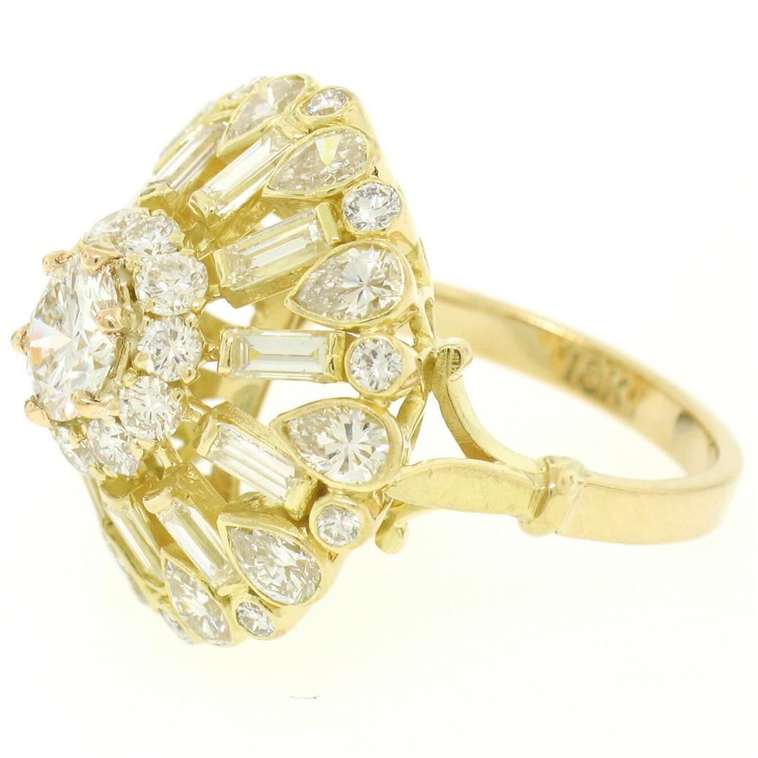One GIA Cert 18K Yellow Gold 5.56ctw Round & Baguette Diamond Waterfall Cluster Ring. Item Details: Material: 18k Solid Yellow Gold, Weight: 9.70 Grams, Stone(s): (1) Natural Genuine Diamond - Prong Set - *See Certification Details Below*, (11) Natural Genuine Diamonds - Baguette Cut - Bar Set - G/H Color - VS1/VS2 Clarity - 1.54ctw (approx.), (11) Natural Genuine Diamonds - Pear Cut - Bezel Set - G/H Color - VS1/VS2 Clarity - 1.98ctw (approx.), (22) Natural Genuine Diamonds - Round Brilliant Cut - Bezel and Prong Set - G/H Color - VS1/VS2 - 1.20ctw (approx.), Total Carat Weight: 5.56ctw (approx.), Ring Size: 6.50 One Ring Width: 22.0mm in diameter. Ring Height: 11.60mm rise off the finger: Condition: Excellent condition! GIA certified center stone w/ certification., Certification Details, Laboratory: GIA, Report Number: 5161773975, Stone Type: Diamond, Stone Shape: Round Brilliant, Carat Weight: 0.84, Dimensions: 6.21 x 6.31 x 3.64 mm Color: G Clarity: SI1 Cut Grade: Very Good Fluorescence: NONE