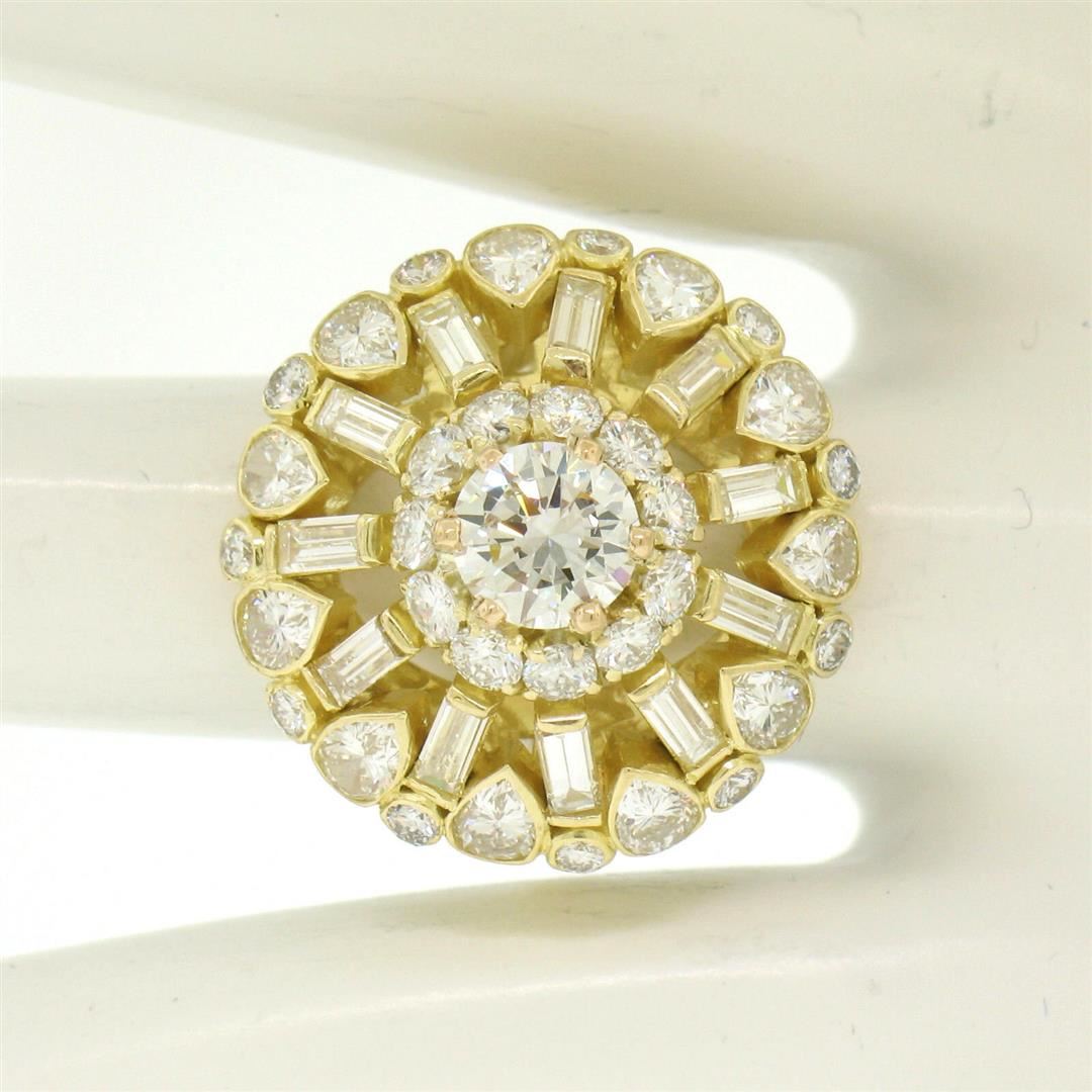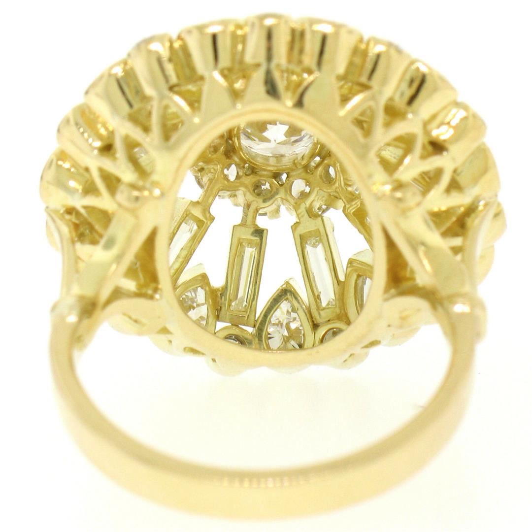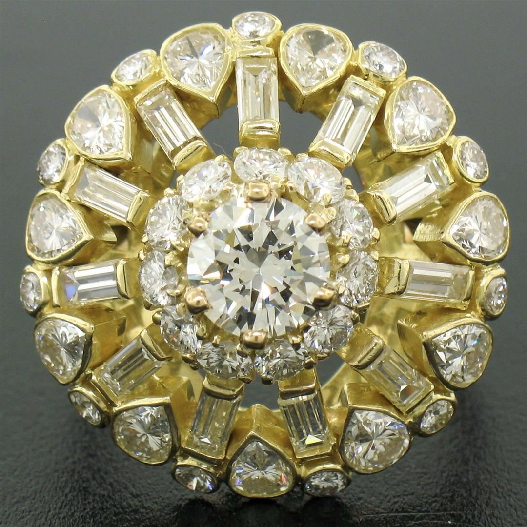 One GIA Cert 18K Yellow Gold 5.56ctw Round & Baguette Diamond Waterfall Cluster Ring. Item Details: Material: 18k Solid Yellow Gold, Weight: 9.70 Grams, Stone(s): (1) Natural Genuine Diamond - Prong Set - *See Certification Details Below*, (11) Natural Genuine Diamonds - Baguette Cut - Bar Set - G/H Color - VS1/VS2 Clarity - 1.54ctw (approx.), (11) Natural Genuine Diamonds - Pear Cut - Bezel Set - G/H Color - VS1/VS2 Clarity - 1.98ctw (approx.), (22) Natural Genuine Diamonds - Round Brilliant Cut - Bezel and Prong Set - G/H Color - VS1/VS2 - 1.20ctw (approx.), Total Carat Weight: 5.56ctw (approx.), Ring Size: 6.50 One Ring Width: 22.0mm in diameter. Ring Height: 11.60mm rise off the finger: Condition: Excellent condition! GIA certified center stone w/ certification., Certification Details, Laboratory: GIA, Report Number: 5161773975, Stone Type: Diamond, Stone Shape: Round Brilliant, Carat Weight: 0.84, Dimensions: 6.21 x 6.31 x 3.64 mm Color: G Clarity: SI1 Cut Grade: Very Good Fluorescence: NONE