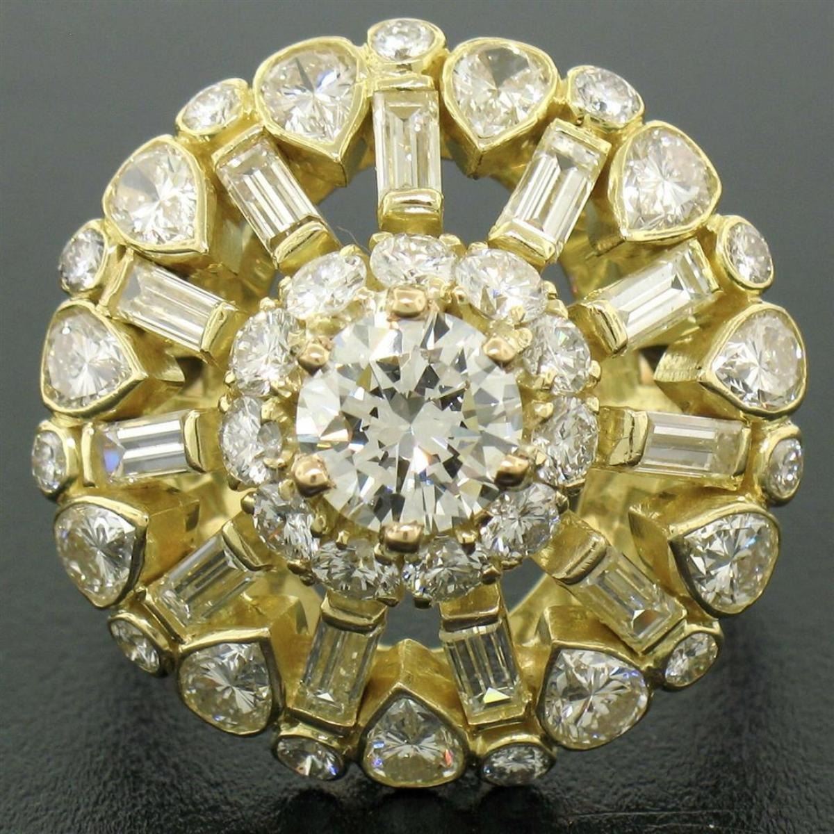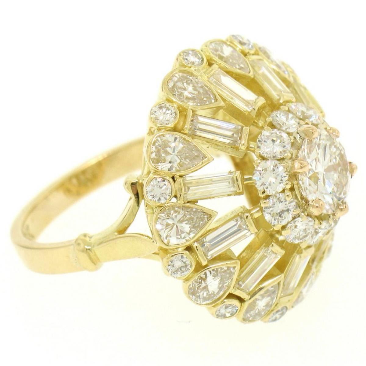 One GIA Cert 18K Yellow Gold 5.56ctw Round & Baguette Diamond Waterfall Cluster Ring. Item Details: Material:  18k Solid Yellow Gold, Weight:  9.70 Grams, Stone(s):  (1) Natural Genuine Diamond - Prong Set - *See Certification Details Below*, (11) Natural Genuine Diamonds - Baguette Cut - Bar Set - G/H Color - VS1/VS2 Clarity - 1.54ctw (approx.), (11) Natural Genuine Diamonds - Pear Cut - Bezel Set - G/H Color - VS1/VS2 Clarity -  1.98ctw (approx.), (22) Natural Genuine Diamonds - Round Brilliant Cut - Bezel and Prong Set - G/H Color - VS1/VS2 - 1.20ctw (approx.), Total Carat Weight:  5.56ctw (approx.), Ring Size:  6.50 One Ring Width:  22.0mm in diameter. Ring Height:  11.60mm rise off the finger: Condition:  Excellent condition! GIA certified center stone w/ certification., Certification Details, Laboratory:  GIA, Report Number:  5161773975, Stone Type:  Diamond, Stone Shape:  Round Brilliant, Carat Weight:  0.84, Dimensions:  6.21 x 6.31 x 3.64 mm Color:  G Clarity:  SI1 Cut Grade:  Very Good Fluorescence:  NONE
