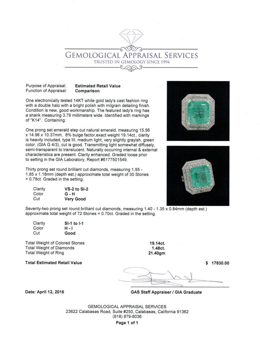 One electronically tested 14KT white gold lady's cast fashion ring with a double halo with a bright polish with milgrain detailing finish. The featured lady's ring has a shank measuring 3.79 millimeters wide. Identified with markings of "K14". Condition is new, good workmanship. Containing: One prong set emerald step cut natural emerald, measuring 15.56 x 14.96 x 10.37mm, 8%. bulge factor, exact weight 19.14ct., clarity is heavily included, type III, medium light, very slightly grayish, green color, (GIA G 4/3), cut is good. Transmitting light somewhat diffusely, semi-transparent to translucent. Naturally occurring internal & external characteristics are present. Clarity enhanced. Graded loose prior to setting in the GIA Laboratory, Report #6177501549.Thirty prong set round brilliant cut diamonds, measuring 1.95 - 1.85 x 1.18mm (depth est.) approximate total weight of 30 Stones = 0.78ct. Graded in the setting. Clarity: VS-2 to SI-2. Color: G - Very Good Seventy-Two prong set round brilliant cut diamonds, measuring 1.40 - 1.35 x 0.84mm (depth est.) approximate total weight of 72 Stones = 0.70ct. Graded in the setting. Clarity: SI-1 to I-1. Color: H - I. Cut Good. Total Weight of Colored Stones 19.14ct. Total Weight of Diamonds 1.48ct. Total Weight of Ring 21.40gm. GAS Appraised at $17,830.00.
