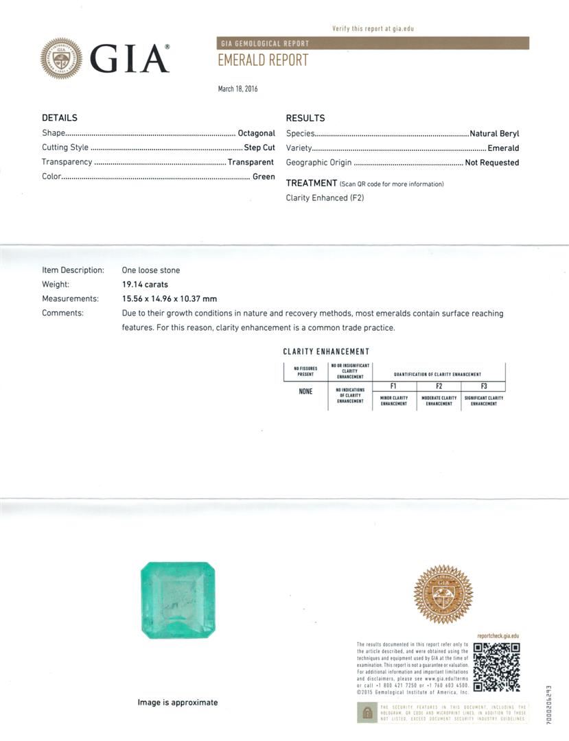 One electronically tested 14KT white gold lady's cast fashion ring with a double halo with a bright polish with milgrain detailing finish. The featured lady's ring has a shank measuring 3.79 millimeters wide. Identified with markings of "K14". Condition is new, good workmanship. Containing: One prong set emerald step cut natural emerald, measuring 15.56 x 14.96 x 10.37mm, 8%. bulge factor, exact weight 19.14ct., clarity is heavily included, type III, medium light, very slightly grayish, green color, (GIA G 4/3), cut is good. Transmitting light somewhat diffusely, semi-transparent to translucent. Naturally occurring internal & external characteristics are present. Clarity enhanced. Graded loose prior to setting in the GIA Laboratory, Report #6177501549.Thirty prong set round brilliant cut diamonds, measuring 1.95 - 1.85 x 1.18mm (depth est.) approximate total weight of 30 Stones = 0.78ct. Graded in the setting. Clarity: VS-2 to SI-2. Color: G - Very Good Seventy-Two prong set round brilliant cut diamonds, measuring 1.40 - 1.35 x 0.84mm (depth est.) approximate total weight of 72 Stones = 0.70ct. Graded in the setting. Clarity: SI-1 to I-1. Color: H - I. Cut Good. Total Weight of Colored Stones 19.14ct. Total Weight of Diamonds 1.48ct. Total Weight of Ring 21.40gm. GAS Appraised at $17,830.00.