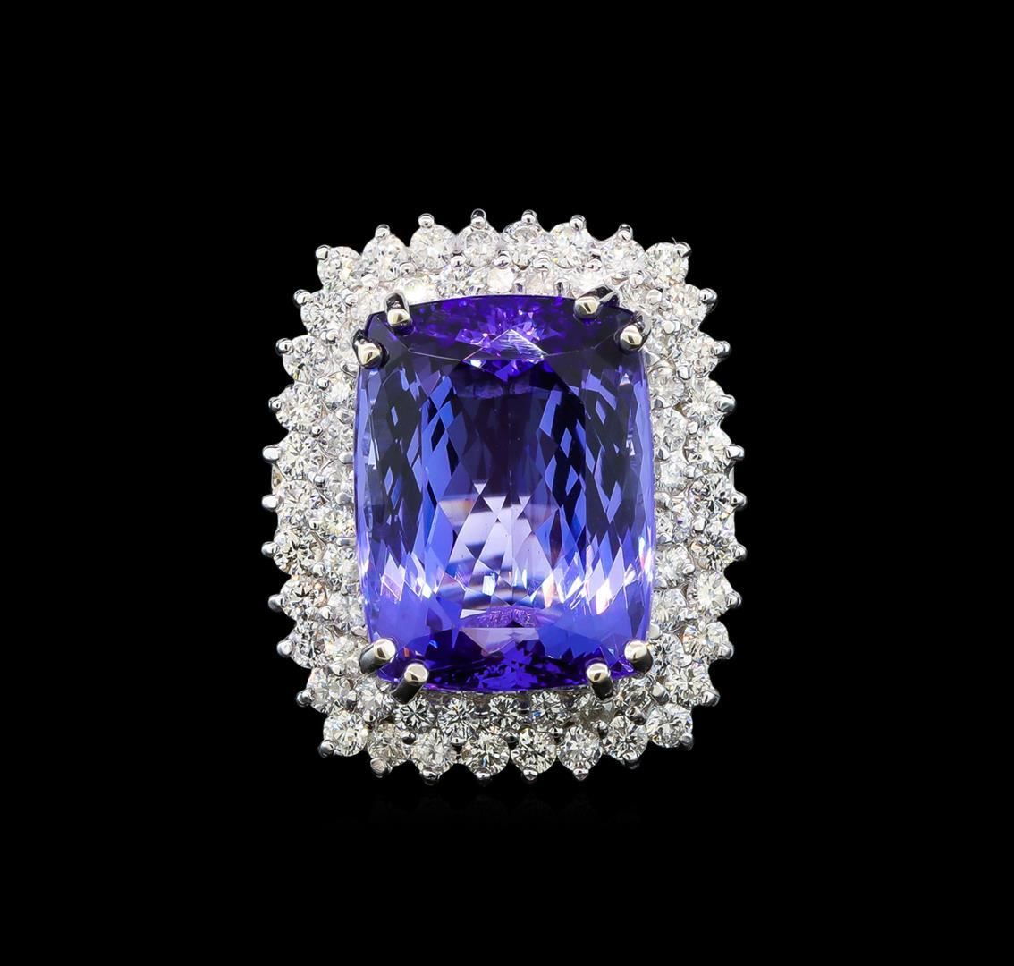 One electronically tested 14KT white gold lady's cast fashion ring with a double basket halo with a bright polish finish. The featured lady's ring has a shank measuring 2.68 millimeters wide. Identified with markings of 'K14'. Condition is new, good workmanship. Containing: One prong set rectangular cushion modified brilliant cut natural tanzanite, measuring 17.20 x 13.05 x 9.11mm, (depth est.) 20%. bulge factor, approximate weight of 19.22ct., clarity is eye clean, medium, moderately strong, violetish blue color, (GIA vB 5/4), cut is very good. Transmitting light with no distortion, transparent. Colored gemstones are presumed to have been subjected to commonly used enhancement processes. Graded loose prior to setting in the GIA Laboratory, Report #2175668725. Thirty-Four prong set round brilliant cut diamonds, measuring 2.10 - 2.00 x 1.27mm (depth est.) approximate total weight of 34 Stones = 1.10 ct. Graded in the setting. Clarity SI-1 to I-1. Color: H - I Cut Good Thirty prong set round brilliant cut diamonds, measuring 1.90 - 1.80 x 1.15mm (depth est.) approximate total weight of 30 Stones = 0.72ct. Graded in the setting. Clarity SI-1 to I-1. Color: H - I Cut Good. Total Weight of Colored Stones 19.22ct.. Total Weight of Diamonds 1.82ct.. Total Weight of Ring 17.20gm. GAS Appraised.
