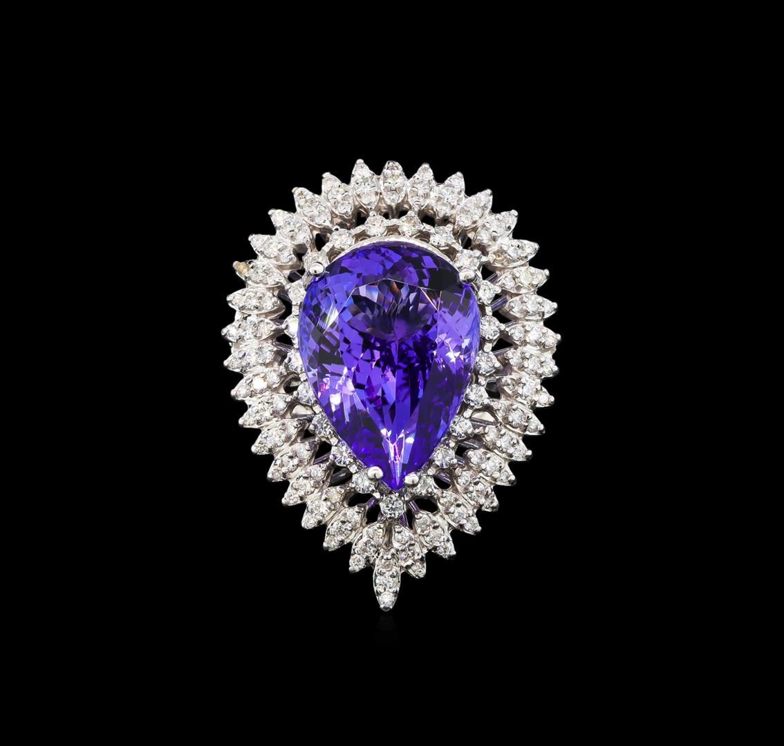 One electronically tested 14KT white gold lady's cast fashion ring with a basket halo with a bright polish finish. The featured lady's ring has a shank measuring 3.50 millimeters wide. Identified with markings of 'K14'. Condition is new, good workmanship. Containing: One prong set pear modified brilliant cut natural tanzanite, measuring 19.48 x 14.20 x 10.51mm, (depth est.) approximate weight of 19.38ct., clarity is eye clean, medium, moderately strong, violet color, (GIA V 5/4), cut is very good. Transmitting light with no distortion, transparent. Colored gemstones are presumed to have been subjected to commonly used enhancement processes. Graded loose prior to setting in the GIA Laboratory, Report #1172668615. Twenty-One prong set round brilliant cut diamonds, measuring 2.00 - 1.90 x 1.21mm (depth est.) approximate total weight of 21 Stones = 0.59ct. Graded in the setting. Clarity SI-1 to I-1. Color: H - I Cut Good Thirty-Six prong set round brilliant cut diamonds, measuring 1.45 - 1.35 x 0.87mm (depth est.) approximate total weight of 36 Stones = 0.37ct. Graded in the setting. Clarity SI-1 to I-1. Color: G - I Cut Good Seventy-Two prong set round brilliant cut diamonds, measuring 1.20 - 1.10 x 0.71mm (depth est.) approximate total weight of 72 Stones = 0.41ct. Graded in the setting. Clarity SI-1 to I-1. Color: G - I Cut Good. Total Weight of Colored Stones 19.38ct.. Total Weight of Diamonds 1.37ct.. Total Weight of Ring 16.10gm. GAS Appraised at $31,490.00.