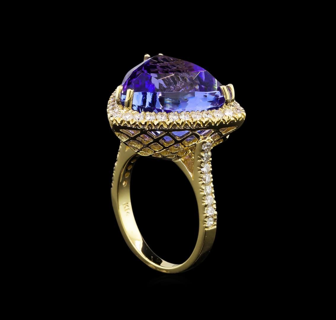 One electronically tested 14KT yellow gold lady's cast fashion ring with a basket halo with a bright polish finish. The featured lady's ring has a shank measuring 2.29 millimeters wide. Identified with markings of 'K14'. Condition is new, good workmanship. Containing: One prong set triangle modified brilliant cut natural tanzanite, measuring 15.75 x 15.49 x 12.17mm, (depth est.) 9%. bulge factor, approximate total weight of 19.46ct., clarity is eye clean, medium, strong, violet color, (GIA V 5/5), cut is very good. Transmitting light with no distortion, transparent. Colored gemstones are presumed to have been subjected to commonly used enhancement processes. Graded loose prior to setting in the GIA Laboratory, Report #5172665896. Fifty prong set round brilliant cut diamonds, measuring 1.70 - 1.65 x 1.04mm (depth est.) approximate total weight of 50 Stones = 0.90ct. Graded in the setting. Clarity SI-1 to I-1. Color: H - I Cut Good. Total Weight of Colored Stones 19.46ct.. Total Weight of Diamonds 0.90ct.. Total Weight of Ring 11.20gm. GAS Appraised at $30,420.00.