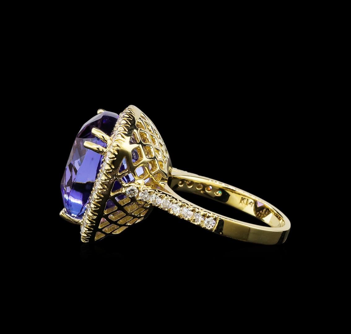 One electronically tested 14KT yellow gold lady's cast fashion ring with a basket halo with a bright polish finish. The featured lady's ring has a shank measuring 2.29 millimeters wide. Identified with markings of 'K14'. Condition is new, good workmanship. Containing: One prong set triangle modified brilliant cut natural tanzanite, measuring 15.75 x 15.49 x 12.17mm, (depth est.) 9%. bulge factor, approximate total weight of 19.46ct., clarity is eye clean, medium, strong, violet color, (GIA V 5/5), cut is very good. Transmitting light with no distortion, transparent. Colored gemstones are presumed to have been subjected to commonly used enhancement processes. Graded loose prior to setting in the GIA Laboratory, Report #5172665896. Fifty prong set round brilliant cut diamonds, measuring 1.70 - 1.65 x 1.04mm (depth est.) approximate total weight of 50 Stones = 0.90ct. Graded in the setting. Clarity SI-1 to I-1. Color: H - I Cut Good. Total Weight of Colored Stones 19.46ct.. Total Weight of Diamonds 0.90ct.. Total Weight of Ring 11.20gm. GAS Appraised at $30,420.00.