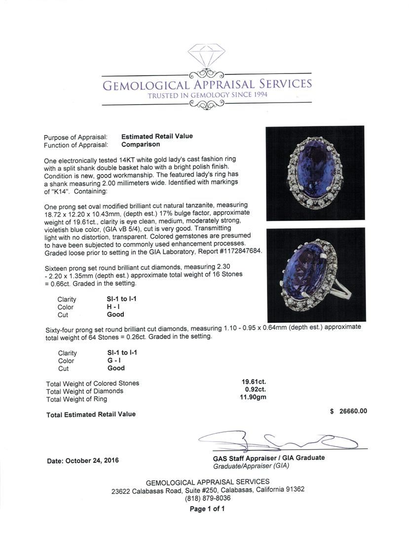 One electronically tested 14KT white gold lady's cast fashion ring with a split shank double basket halo with a bright polish finish. The featured lady's ring has a shank measuring 2.00 millimeters wide. Identified with markings of 'K14'. Condition is new, good workmanship. Containing: One prong set oval modified brilliant cut natural tanzanite, measuring 18.72 x 12.20 x 10.43mm, (depth est.) 17%. bulge factor, approximate weight of 19.61ct., clarity is eye clean, medium, moderately strong, violetish blue color, (GIA vB 5/4), cut is very good. Transmitting light with no distortion, transparent. Colored gemstones are presumed to have been subjected to commonly used enhancement processes. Graded loose prior to setting in the GIA Laboratory, Report #1172847684. Sixteen prong set round brilliant cut diamonds, measuring 2.30 - 2.20 x 1.35mm (depth est.) approximate total weight of 16 Stones = 0.66ct. Graded in the setting. Clarity SI-1 to I-1. Color: H - I Cut Good Sixty-Four prong set round brilliant cut diamonds, measuring 1.10 - 0.95 x 0.64mm (depth est.) approximate total weight of 64 Stones = 0.26ct. Graded in the setting. Clarity SI-1 to I-1. Color: G - I Cut Good. Total Weight of Colored Stones 19.61ct.. Total Weight of Diamonds 0.92ct.. Total Weight of Ring 11.90gm. GAS Appraised at $26,660.00.