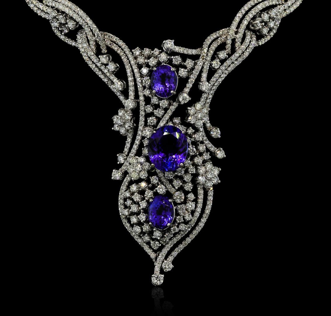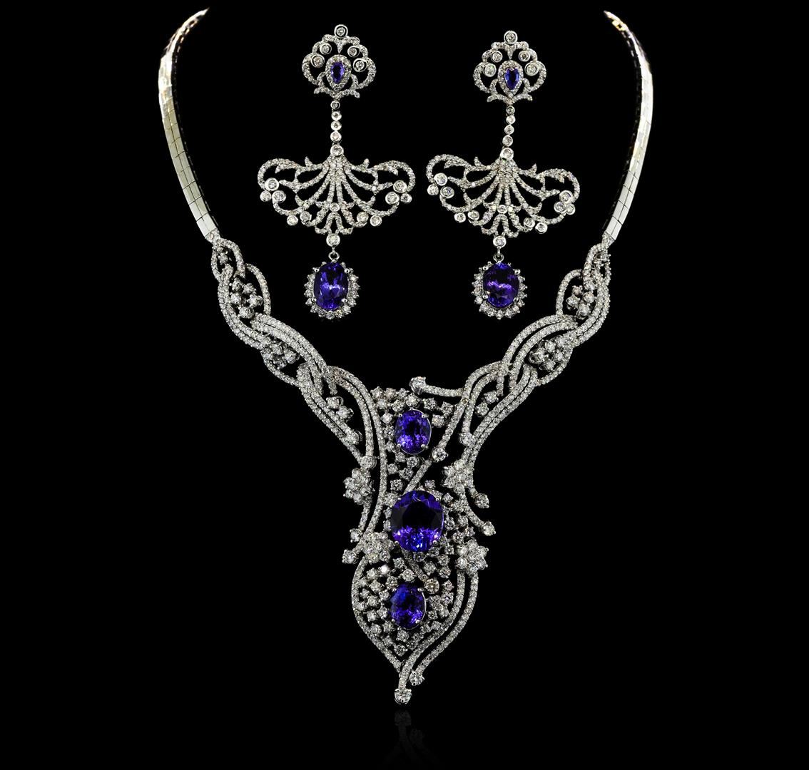 One electronically tested 14KT white gold lady's combination cast & assembled tanzanite and diamond suite. The featured lady's suite contains a necklace and a pair of dangle earrings. The sixteen inch long necklace contains three oval tanzanites surrounded by single diamonds and diamond encrusted freeform ribbons, terminating in a tongue clasp with a foldover safety. The dangle earrings feature a chandelier motif with an attached, dangling oval basket halo set tanzanite and friction backs. Identified with markings of '14K 585'. Containing: One prong set oval modified brilliant cut natural tanzanite, measuring 13.16 x 11.29 x 6.61mm, (depth est.) 3%. bulge factor, approximate weight of 7.15ct., clarity is eye clean, medium dark, strong, violetish blue color, (GIA vB 6/5), cut is very good. Transmitting light with no distortion, transparent. Colored gemstones are presumed to have been subjected to commonly used enhancement processes. Graded loose prior to setting in the GIA Laboratory, Report #1172665873. Two prong set oval modified brilliant cut natural tanzanites, measuring 9.40 x 7.60 x 6.15mm, (depth est.) approximate total weight of 5.98ct., clarity is eye clean, medium, moderately strong, violetish blue color, (GIA vB 5/4), cut is very good. Transmitting light with no distortion, transparent. Colored gemstones are presumed to have been subjected to commonly used enhancement processes. Graded in the setting. Two prong set oval modified brilliant cut natural tanzanites, measuring 10.63 x 7.65 x 5.38mm, (depth est.) approximate total weight of 6.08ct., clarity is eye clean, medium, moderately strong, violetish blue color, (GIA vB 5/4), cut is very good. Transmitting light with no distortion, transparent. Colored gemstones are presumed to have been subjected to commonly used enhancement processes. Graded in the setting. Two prong set pear modified brilliant cut natural tanzanites, measuring 5.00 x 3.00 x 1.95mm, (depth est.) approximate total weight of 0.40ct., clarity is eye clean, medium, moderately strong, violet color, (GIA V 5/4), cut is good. Transmitting light with no distortion, transparent. Colored gemstones are presumed to have been subjected to commonly used enhancement processes. Graded in the setting. One Hundred Sixty-Eight prong set round brilliant cut diamonds, measuring 2.30 - 2.00 x 1.29mm (depth est.) approximate total weight of 168 Stones = 5.92ct. Graded in the setting. Clarity SI-1 to SI-2. Color: H - I Cut Good Four Hundred Seventy-Five prong set round brilliant cut diamonds, measuring 1.50 - 1.40 x 0.87mm (depth est.) approximate total weight of 475 Stones = 5.28ct. Graded in the setting. Clarity SI-1 to I-1. Color: G - I Cut Good Forty-Four bezel set round brilliant cut diamonds, measuring 2.20 - 1.80 x 1.24mm (depth est.) approximate total weight of 44 Stones = 1.33ct. Graded in the setting. Clarity SI-1 to SI-2. Color: H - I Cut Good Three Hundred Ninety prong set round brilliant cut diamonds, measuring 1.20 - 1.10 x 0.71mm (depth est.) approximate total weight of 390 Stones = 2.25ct. Graded in the setting. Clarity SI-1 to I-1. Color: H - I Cut Good. Total Weight of Colored Stones 19.61ct.. Total Weight of Diamonds 14.78ct.. Total Weight of Suite 72.40gm. GAS Appraised at $83,005.00.