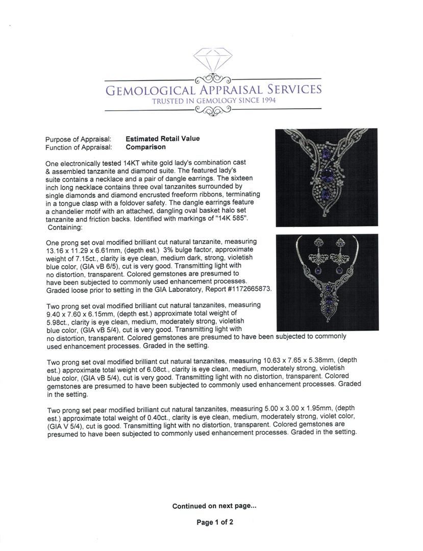 One electronically tested 14KT white gold lady's combination cast & assembled tanzanite and diamond suite. The featured lady's suite contains a necklace and a pair of dangle earrings. The sixteen inch long necklace contains three oval tanzanites surrounded by single diamonds and diamond encrusted freeform ribbons, terminating in a tongue clasp with a foldover safety. The dangle earrings feature a chandelier motif with an attached, dangling oval basket halo set tanzanite and friction backs. Identified with markings of '14K 585'. Containing: One prong set oval modified brilliant cut natural tanzanite, measuring 13.16 x 11.29 x 6.61mm, (depth est.) 3%. bulge factor, approximate weight of 7.15ct., clarity is eye clean, medium dark, strong, violetish blue color, (GIA vB 6/5), cut is very good. Transmitting light with no distortion, transparent. Colored gemstones are presumed to have been subjected to commonly used enhancement processes. Graded loose prior to setting in the GIA Laboratory, Report #1172665873. Two prong set oval modified brilliant cut natural tanzanites, measuring 9.40 x 7.60 x 6.15mm, (depth est.) approximate total weight of 5.98ct., clarity is eye clean, medium, moderately strong, violetish blue color, (GIA vB 5/4), cut is very good. Transmitting light with no distortion, transparent. Colored gemstones are presumed to have been subjected to commonly used enhancement processes. Graded in the setting. Two prong set oval modified brilliant cut natural tanzanites, measuring 10.63 x 7.65 x 5.38mm, (depth est.) approximate total weight of 6.08ct., clarity is eye clean, medium, moderately strong, violetish blue color, (GIA vB 5/4), cut is very good. Transmitting light with no distortion, transparent. Colored gemstones are presumed to have been subjected to commonly used enhancement processes. Graded in the setting. Two prong set pear modified brilliant cut natural tanzanites, measuring 5.00 x 3.00 x 1.95mm, (depth est.) approximate total weight of 0.40ct., clarity is eye clean, medium, moderately strong, violet color, (GIA V 5/4), cut is good. Transmitting light with no distortion, transparent. Colored gemstones are presumed to have been subjected to commonly used enhancement processes. Graded in the setting. One Hundred Sixty-Eight prong set round brilliant cut diamonds, measuring 2.30 - 2.00 x 1.29mm (depth est.) approximate total weight of 168 Stones = 5.92ct. Graded in the setting. Clarity SI-1 to SI-2. Color: H - I Cut Good Four Hundred Seventy-Five prong set round brilliant cut diamonds, measuring 1.50 - 1.40 x 0.87mm (depth est.) approximate total weight of 475 Stones = 5.28ct. Graded in the setting. Clarity SI-1 to I-1. Color: G - I Cut Good Forty-Four bezel set round brilliant cut diamonds, measuring 2.20 - 1.80 x 1.24mm (depth est.) approximate total weight of 44 Stones = 1.33ct. Graded in the setting. Clarity SI-1 to SI-2. Color: H - I Cut Good Three Hundred Ninety prong set round brilliant cut diamonds, measuring 1.20 - 1.10 x 0.71mm (depth est.) approximate total weight of 390 Stones = 2.25ct. Graded in the setting. Clarity SI-1 to I-1. Color: H - I Cut Good. Total Weight of Colored Stones 19.61ct.. Total Weight of Diamonds 14.78ct.. Total Weight of Suite 72.40gm. GAS Appraised at $83,005.00.