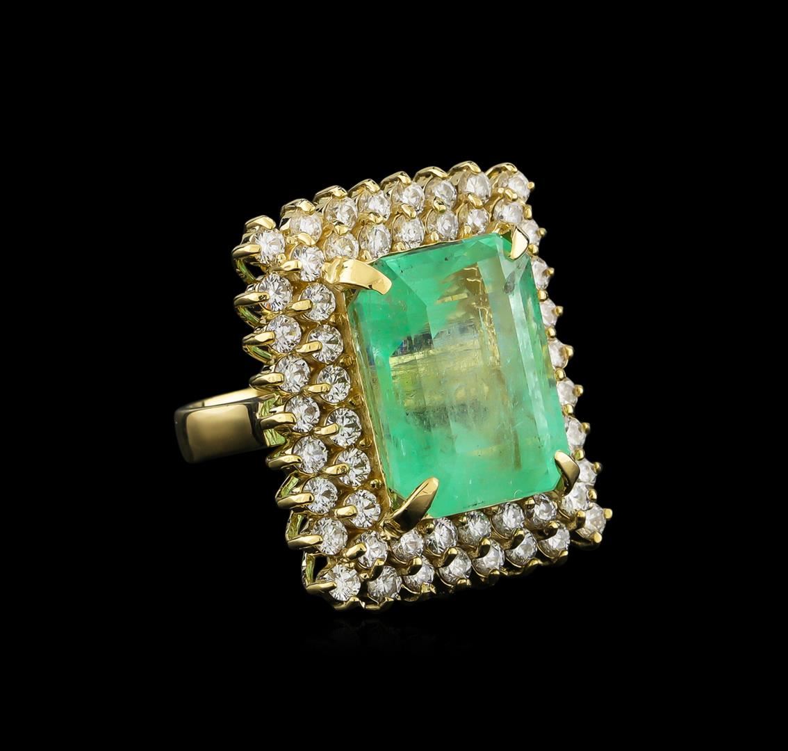 One electronically tested 14KT yellow gold lady's cast fashion ring with a double basket halo with a bright polish finish. The featured lady's ring has a shank measuring 3.72 millimeters wide. Identified with markings of "K14". Condition is new, good workmanship. Containing: One prong set emerald step cut natural emerald, measuring 16.53 x 13.61 x 11.27mm, 6%. bulge factor, approximate weight of 19.72ct., clarity is moderately included, type III, light, very slightly grayish, green color, (GIA G 3/3), cut is good. Transmitting light somewhat diffusely, transparent to translucent. Naturally occurring internal & external characteristics are present. Clarity enhanced. Graded loose prior to setting in the GIA Laboratory, Report #2175501583.Fifty-Six prong set round brilliant cut diamonds, measuring 2.40 - 2.30 x 1.46mm (depth est.) approximate total weight of 56 Stones = 2.80ct. Graded in the setting. Clarity: SI-1 to SI-2. Color: G - I. Cut Very Good. Total Weight of Colored Stones 19.72ct. Total Weight of Diamonds 2.80ct. Total Weight of Ring 15.80gm. GAS Appraised at $16,525.00.