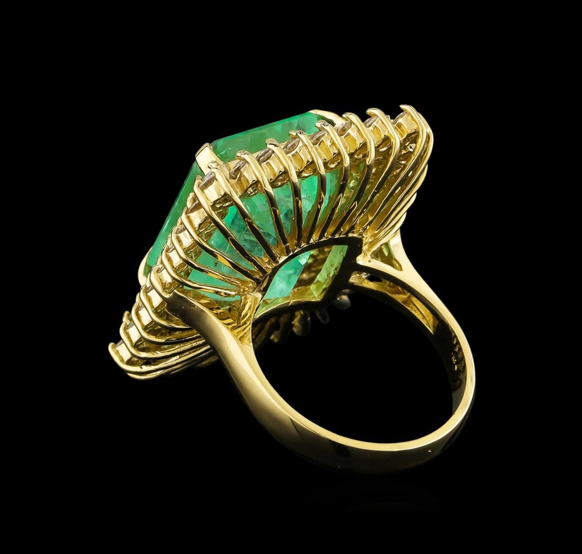 One electronically tested 14KT yellow gold lady's cast fashion ring with a double basket halo with a bright polish finish. The featured lady's ring has a shank measuring 3.72 millimeters wide. Identified with markings of "K14". Condition is new, good workmanship. Containing: One prong set emerald step cut natural emerald, measuring 16.53 x 13.61 x 11.27mm, 6%. bulge factor, approximate weight of 19.72ct., clarity is moderately included, type III, light, very slightly grayish, green color, (GIA G 3/3), cut is good. Transmitting light somewhat diffusely, transparent to translucent. Naturally occurring internal & external characteristics are present. Clarity enhanced. Graded loose prior to setting in the GIA Laboratory, Report #2175501583.Fifty-Six prong set round brilliant cut diamonds, measuring 2.40 - 2.30 x 1.46mm (depth est.) approximate total weight of 56 Stones = 2.80ct. Graded in the setting. Clarity: SI-1 to SI-2. Color: G - I. Cut Very Good. Total Weight of Colored Stones 19.72ct. Total Weight of Diamonds 2.80ct. Total Weight of Ring 15.80gm. GAS Appraised at $16,525.00.