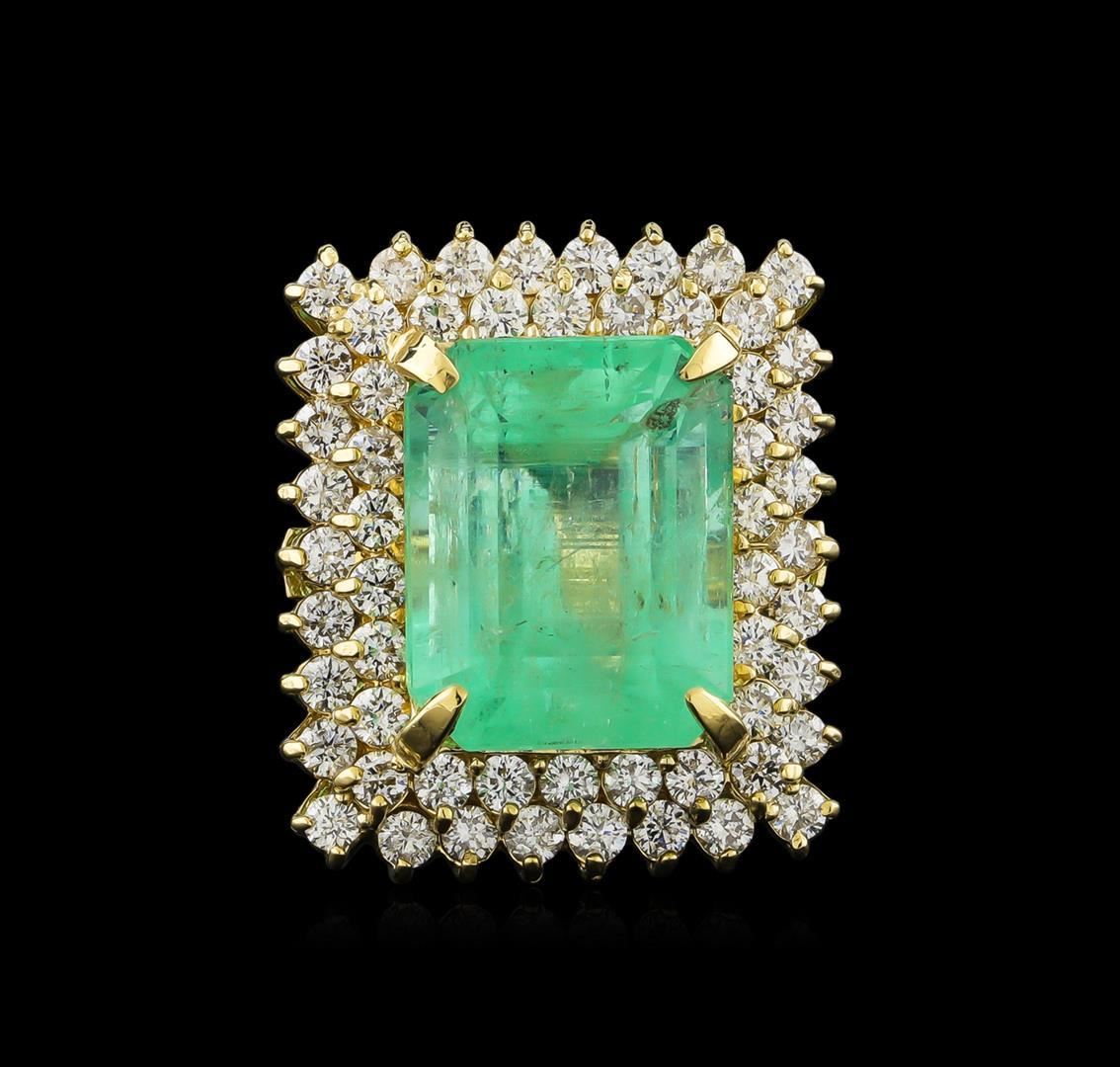 One electronically tested 14KT yellow gold lady's cast fashion ring with a double basket halo with a bright polish finish. The featured lady's ring has a shank measuring 3.72 millimeters wide. Identified with markings of "K14". Condition is new, good workmanship. Containing: One prong set emerald step cut natural emerald, measuring 16.53 x 13.61 x 11.27mm, 6%. bulge factor, approximate weight of 19.72ct., clarity is moderately included, type III, light, very slightly grayish, green color, (GIA G 3/3), cut is good. Transmitting light somewhat diffusely, transparent to translucent. Naturally occurring internal & external characteristics are present. Clarity enhanced. Graded loose prior to setting in the GIA Laboratory, Report #2175501583.Fifty-Six prong set round brilliant cut diamonds, measuring 2.40 - 2.30 x 1.46mm (depth est.) approximate total weight of 56 Stones = 2.80ct. Graded in the setting. Clarity: SI-1 to SI-2. Color: G - I. Cut Very Good. Total Weight of Colored Stones 19.72ct. Total Weight of Diamonds 2.80ct. Total Weight of Ring 15.80gm. GAS Appraised.