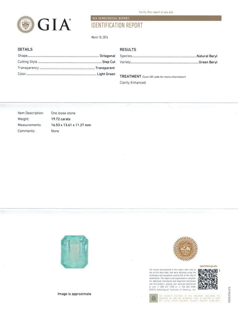 One electronically tested 14KT yellow gold lady's cast fashion ring with a double basket halo with a bright polish finish. The featured lady's ring has a shank measuring 3.72 millimeters wide. Identified with markings of "K14". Condition is new, good workmanship. Containing: One prong set emerald step cut natural emerald, measuring 16.53 x 13.61 x 11.27mm, 6%. bulge factor, approximate weight of 19.72ct., clarity is moderately included, type III, light, very slightly grayish, green color, (GIA G 3/3), cut is good. Transmitting light somewhat diffusely, transparent to translucent. Naturally occurring internal & external characteristics are present. Clarity enhanced. Graded loose prior to setting in the GIA Laboratory, Report #2175501583.Fifty-Six prong set round brilliant cut diamonds, measuring 2.40 - 2.30 x 1.46mm (depth est.) approximate total weight of 56 Stones = 2.80 ct. Graded in the setting. Clarity: SI-1 to SI-2. Color: G - I. Cut Very Good. Total Weight of Colored Stones 19.72ct. Total Weight of Diamonds 2.80 ct. Total Weight of Ring 15.80gm. GAS Appraised.