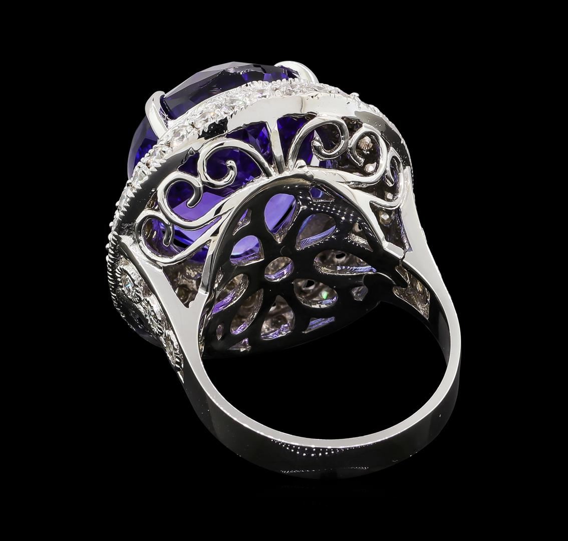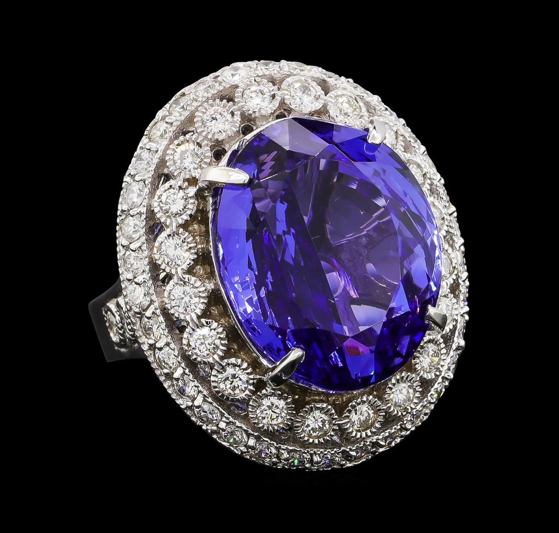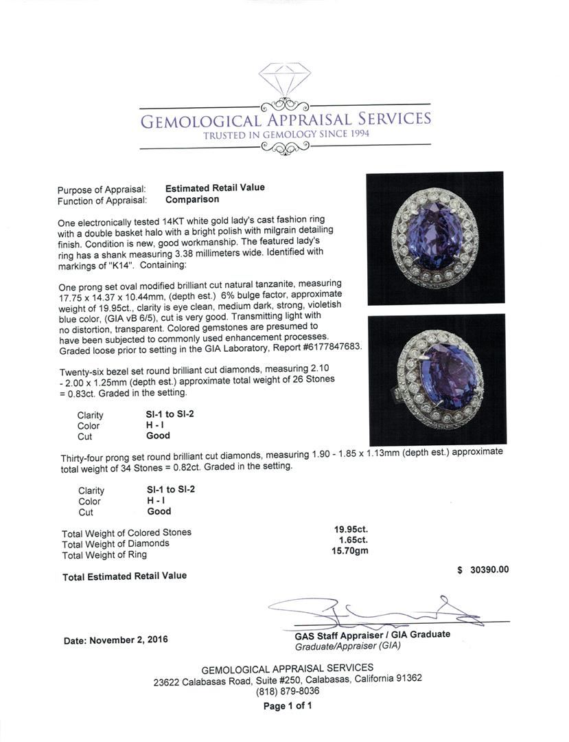 One electronically tested 14KT white gold lady's cast fashion ring with a double basket halo with a bright polish with milgrain detailing finish. The featured lady's ring has a shank measuring 3.38 millimeters wide. Identified with markings of 'K14'. Condition is new, good workmanship. Containing: One prong set oval modified brilliant cut natural tanzanite, measuring 17.75 x 14.37 x 10.44mm, (depth est.) 6%. bulge factor, approximate weight of 19.95ct., clarity is eye clean, medium dark, strong, violetish blue color, (GIA vB 6/5), cut is very good. Transmitting light with no distortion, transparent. Colored gemstones are presumed to have been subjected to commonly used enhancement processes. Graded loose prior to setting in the GIA Laboratory, Report #6177847683. Twenty-Six bezel set round brilliant cut diamonds, measuring 2.10 - 2.00 x 1.25mm (depth est.) approximate total weight of 26 Stones = 0.83ct. Graded in the setting. Clarity SI-1 to SI-2. Color: H - I Cut Good Thirty-Four prong set round brilliant cut diamonds, measuring 1.90 - 1.85 x 1.13mm (depth est.) approximate total weight of 34 Stones = 0.82ct. Graded in the setting. Clarity SI-1 to SI-2. Color: H - I Cut Good. Total Weight of Colored Stones 19.95ct.. Total Weight of Diamonds 1.65ct.. Total Weight of Ring 15.70gm. GAS Appraised at $30,390.00.