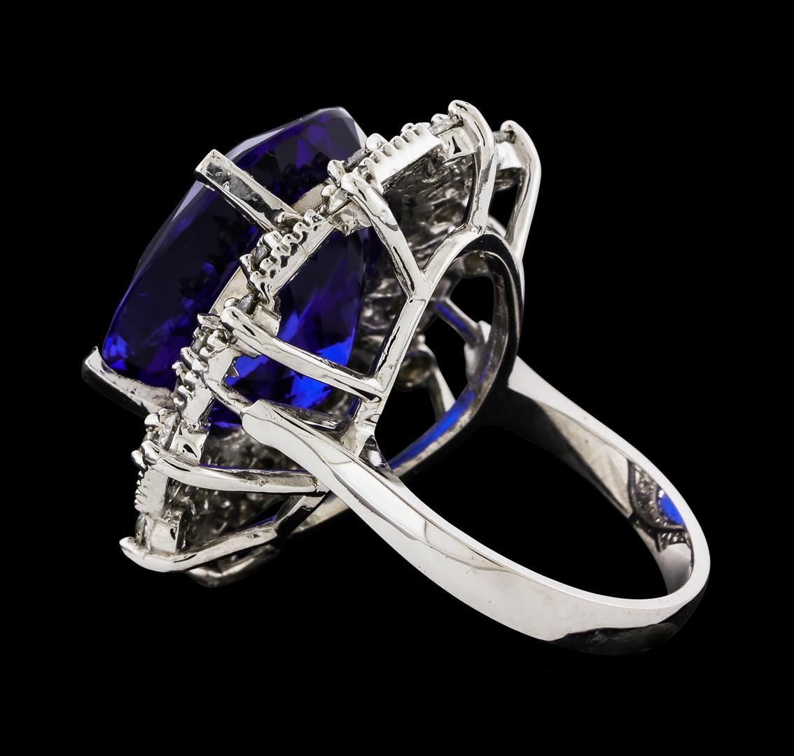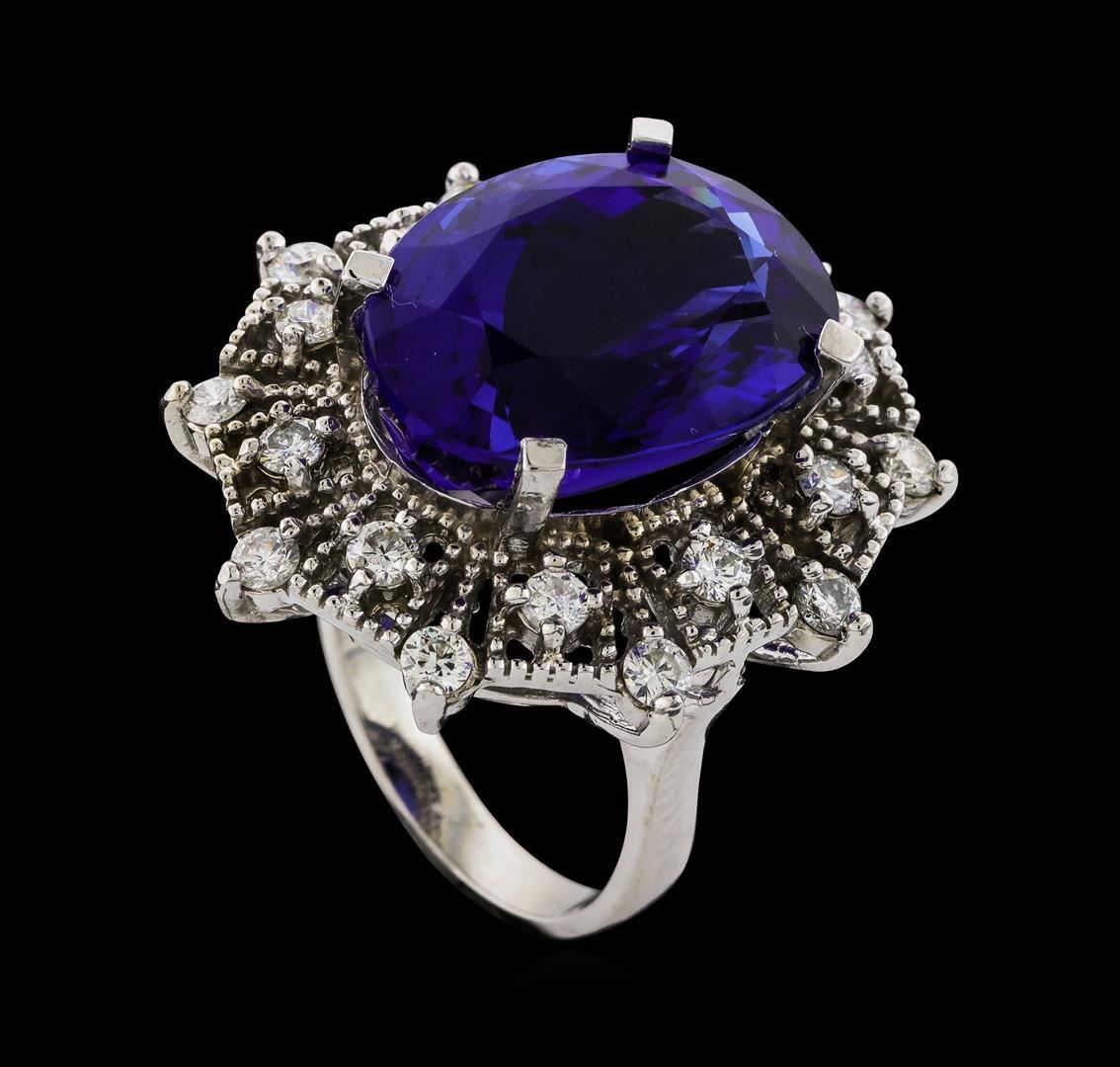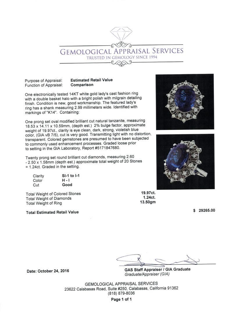 One electronically tested 14KT white gold lady's cast fashion ring with a double basket halo with a bright polish with milgrain detailing finish. The featured lady's ring has a shank measuring 2.99 millimeters wide. Identified with markings of 'K14'. Condition is new, good workmanship. Containing: One prong set oval modified brilliant cut natural tanzanite, measuring 18.53 x 14.11 x 10.59mm, (depth est.) 2%. bulge factor, approximate weight of 19.97ct., clarity is eye clean, dark, strong, violetish blue color, (GIA vB 7/5), cut is very good. Transmitting light with no distortion, transparent. Colored gemstones are presumed to have been subjected to commonly used enhancement processes. Graded loose prior to setting in the GIA Laboratory, Report #5171847680. Twenty prong set round brilliant cut diamonds, measuring 2.60 - 2.50 x 1.58mm (depth est.) approximate total weight of 20 Stones = 1.24ct. Graded in the setting. Clarity SI-1 to I-1. Color: H - I Cut Good. Total Weight of Colored Stones 19.97ct.. Total Weight of Diamonds 1.24ct.. Total Weight of Ring 13.50gm. GAS Appraised.