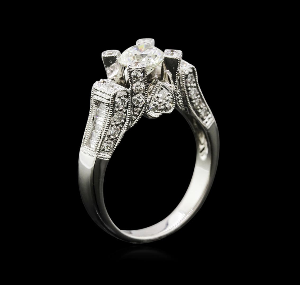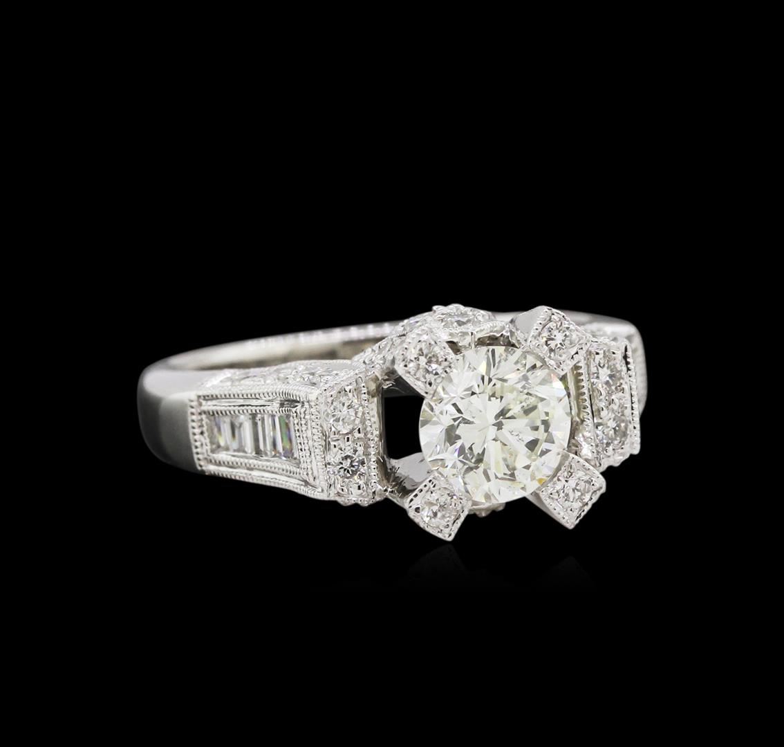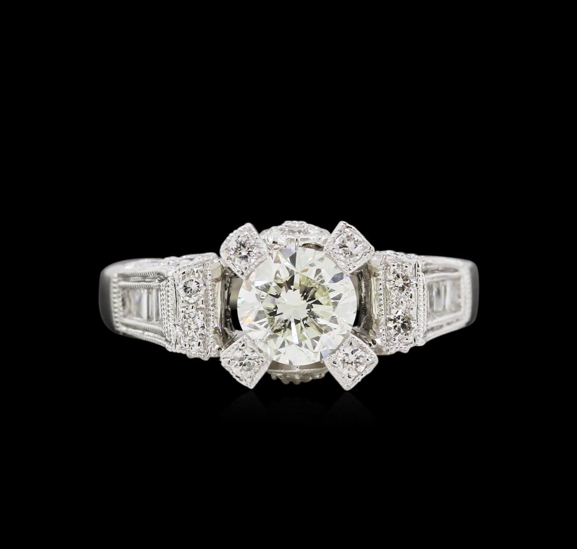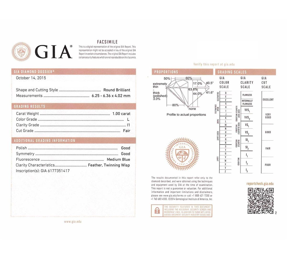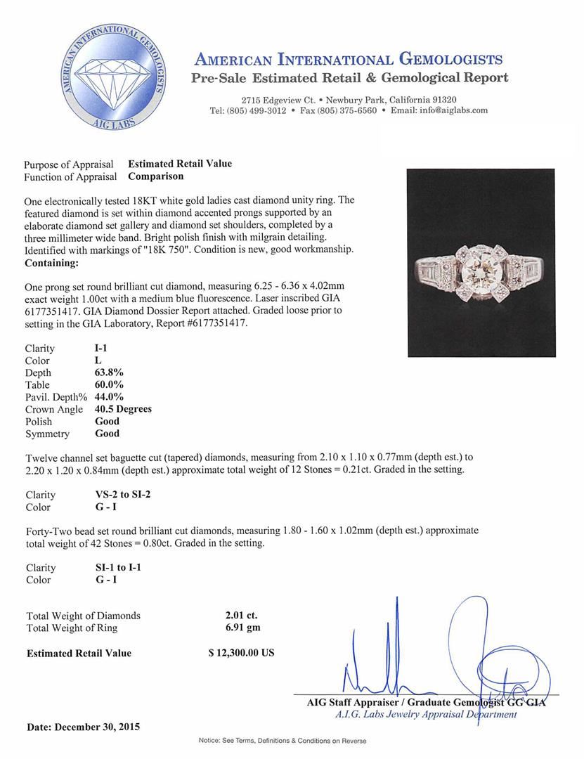 One prong set round brilliant cut diamond, measuring 6.25 - 6.36 x 4.02mm exact weight 1.00ct with a medium blue fluorescence. Laser inscribed GIA 6177351417. GIA Diamond Dossier Report attached. Graded loose prior to setting in the GIA Laboratory, Report #6177351417. Clarity: I-1. Color: L. Depth 63.8%. Table 60.0%. Pavil. Depth%. 44.0%. Crown Angle 40.5 Degrees Twelve channel set baguette cut (tapered) diamonds, measuring from 2.10 x 1.10 x 0.77mm (depth est.) to 2.20 x 1.20 x 0.84mm (depth est.) approximate total weight of 12 Stones = 0.21ct. Graded in the setting. Clarity: VS-2 to SI-2. Color: G - I Forty-Two bead set round brilliant cut diamonds, measuring 1.80 - 1.60 x 1.02mm (depth est.) approximate total weight of 42 Stones = 0.80ct. Graded in the setting. Clarity: SI-1 to I-1. Color: G - I. Total Weight of Diamonds 2.01ct. Total Weight of Ring 6.91gm. AIG Appraised at $12,300.00.