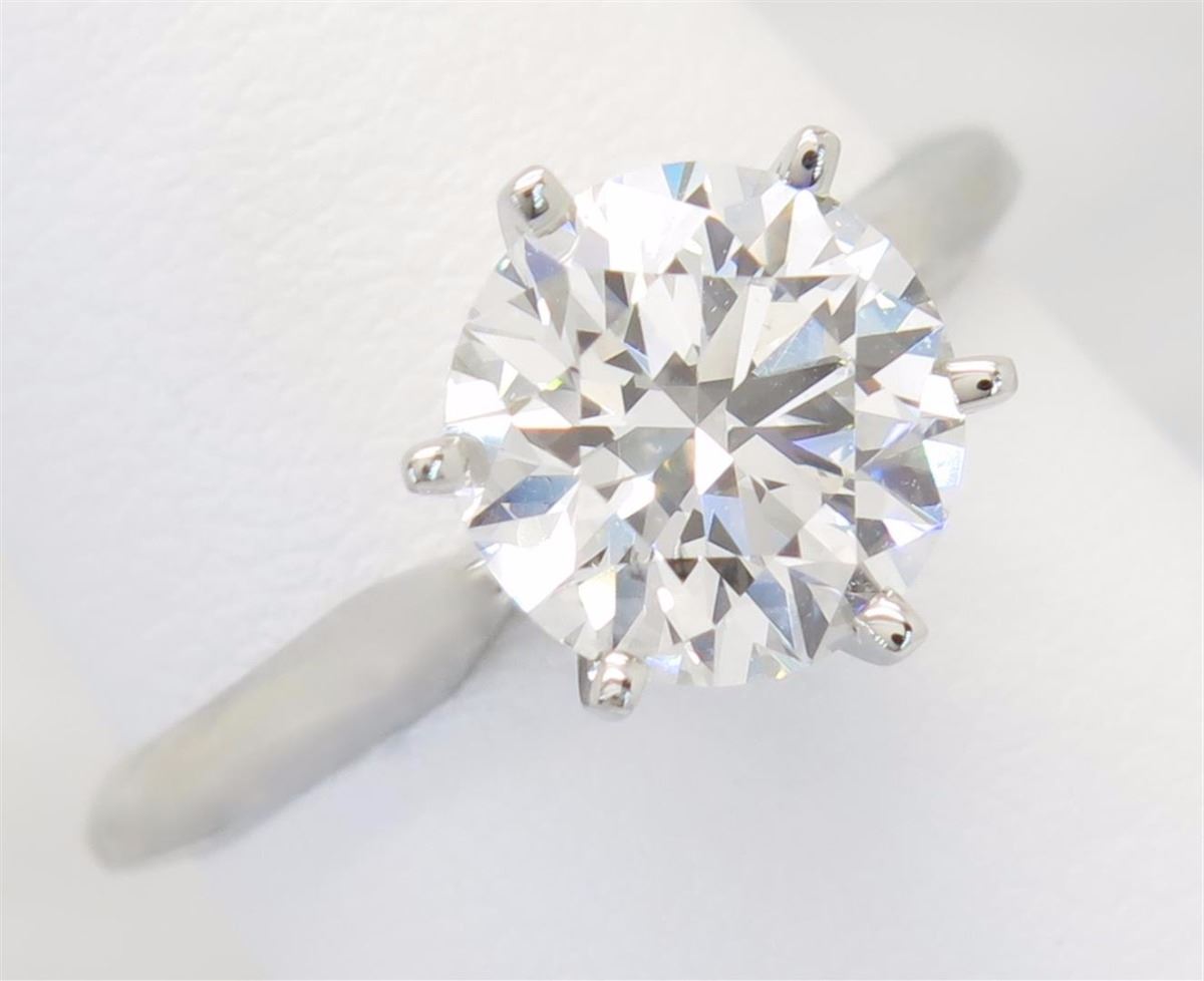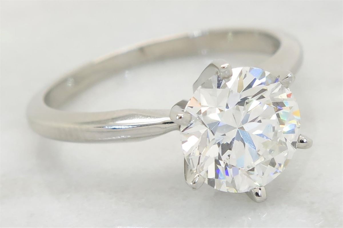 One tested platinum certified diamond ring. Containing: One GIA Certified Round Brilliant Cut Diamond. Size: 2.02CT, Clarity: VS2, Color: F. All diamonds are graded in the mounting unless otherwise stated. Weight of ring: 4.4 grams, Size: 5.75 GIA Appraised.