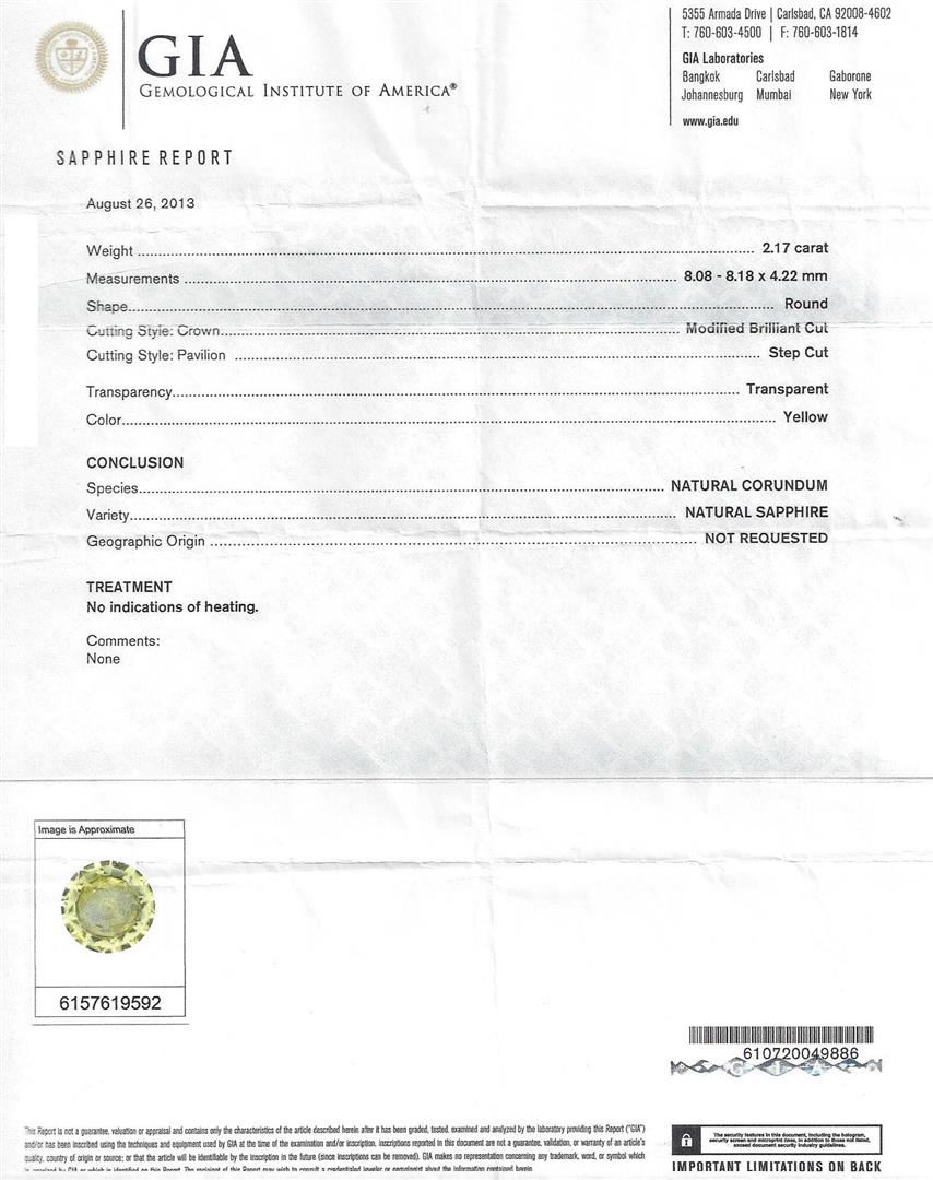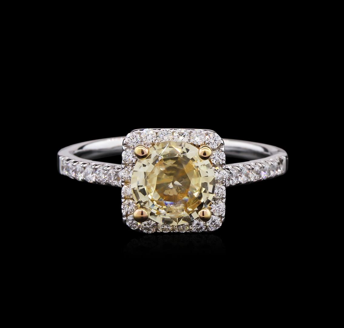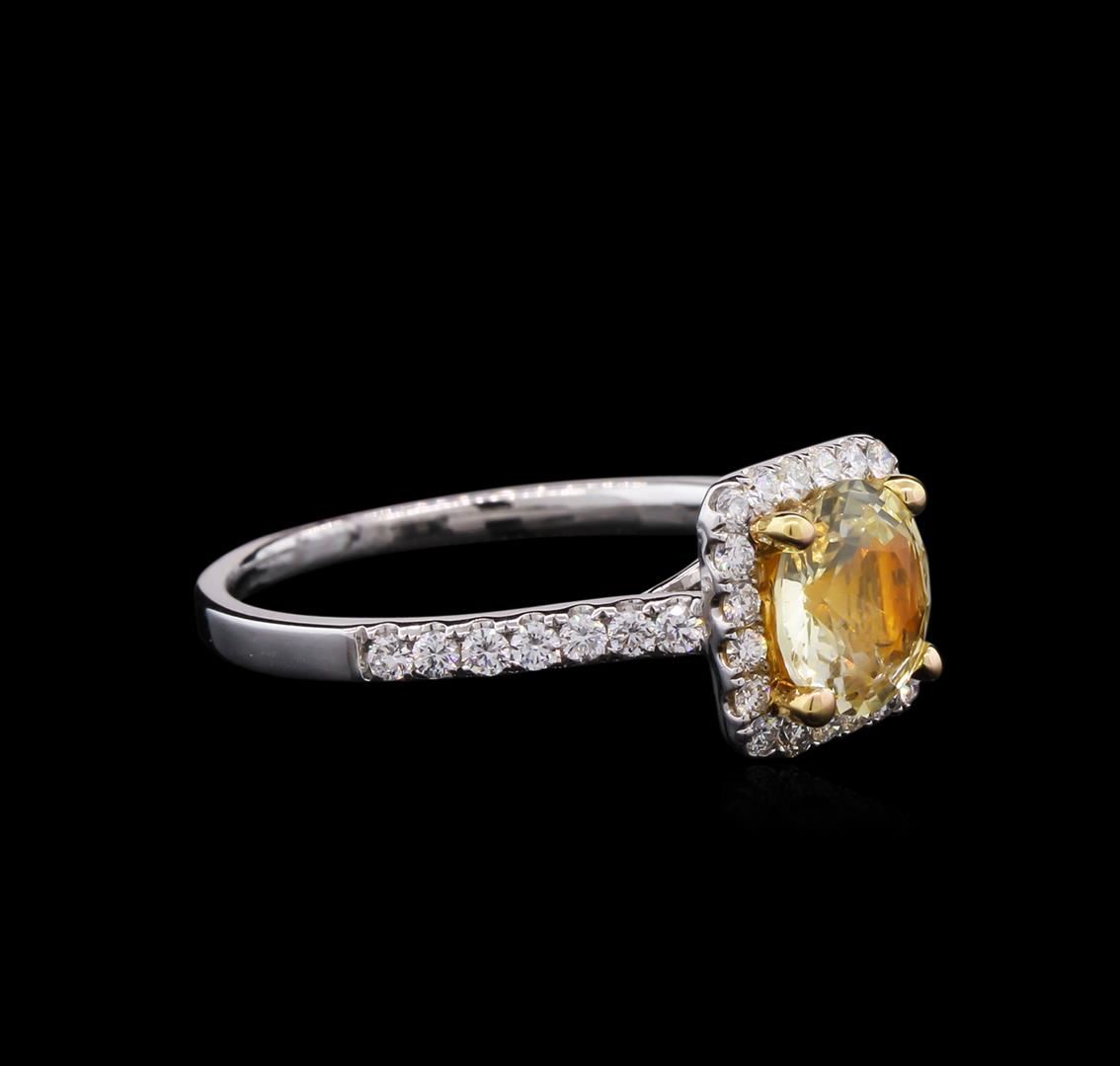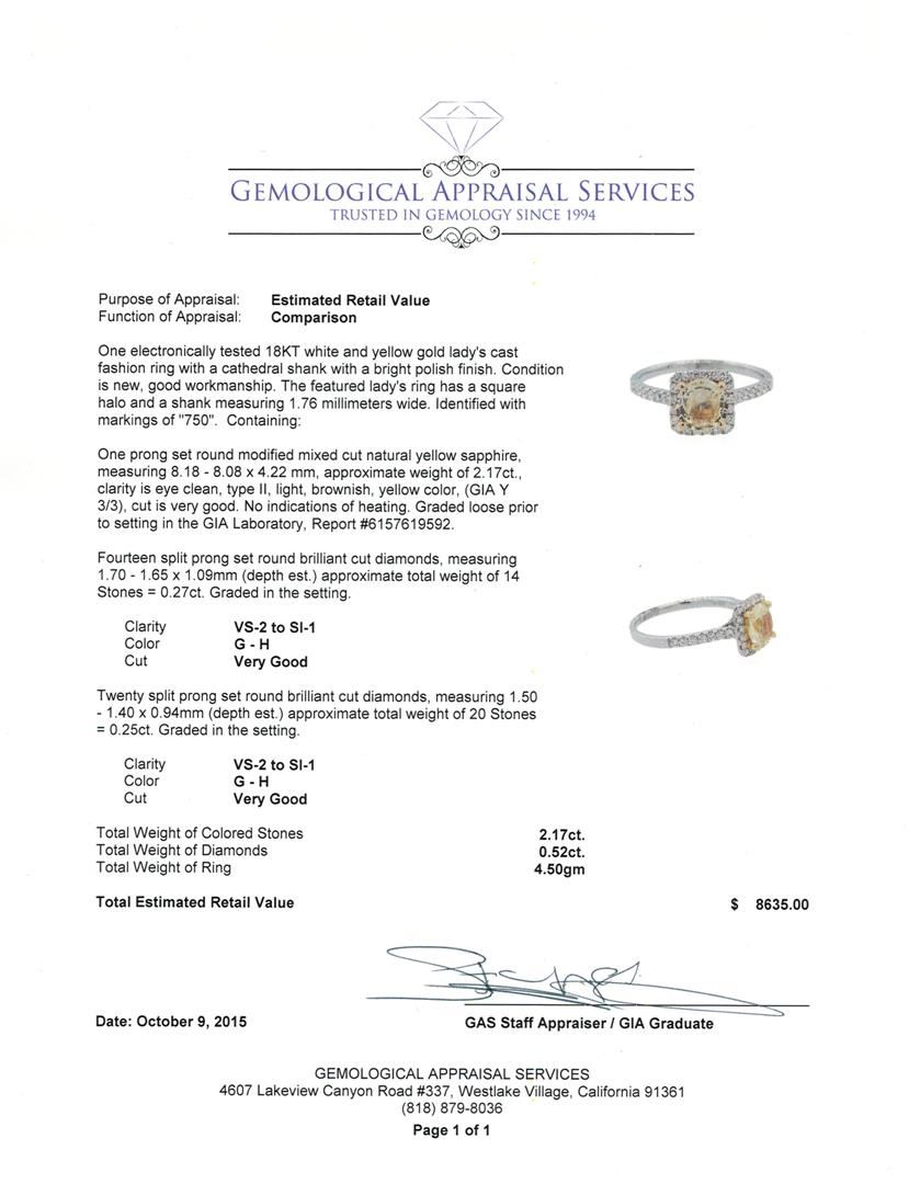 One electronically tested 18KT white and yellow gold lady's cast fashion ring with a cathedral shank with a bright polish finish. The featured lady's ring has a square halo and a shank measuring 1.76 millimeters wide. Identified with markings of "750". Condition is new, good workmanship. Containing: One prong set round modified mixed cut natural yellow sapphire, measuring 8.18 - 8.08 x 4.22 mm, approximate weight of 2.17ct., clarity is eye clean, type II, light, brownish, yellow color, (GIA Y 3/3), cut is very good. No indications of heating. Graded loose prior to setting in the GIA Laboratory, Report #6157619592. Fourteen split prong set round brilliant cut diamonds, measuring 1.70 - 1.65 x 1.09mm (depth est.) approximate total weight of 14 Stones = 0.27ct. Graded in the setting. Clarity: VS-2 to SI-1. Color: G - H. Cut Very Good Twenty split prong set round brilliant cut diamonds, measuring 1.50 - 1.40 x 0.94mm (depth est.) approximate total weight of 20 Stones = 0.25ct. Graded in the setting. Clarity: VS-2 to SI-1. Color: G - H. Cut Very Good. Total Weight of Colored Stones 2.17ct. Total Weight of Diamonds 0.52ct. Total Weight of Ring 4.50gm. GAS Appraised at $8,635.00.