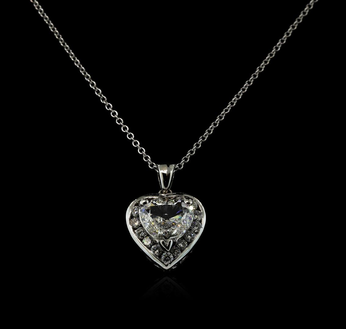 One electronically tested 14KT white gold lady's combination cast & assembled fashion heart shape pendant & chain 18.0' long, 1.3mm round cable link with a lobster claw clasp with a bright polish finish. Identified with markings of '14K'. Condition is new, good workmanship. Containing: One prong set heart shaped cut diamond, measuring 8.28 x 9.05 x 3.16mm (depth est.) , 10.00.%. GTCF approximate weight of 1.57ct. Graded loose prior to setting in the GIA Laboratory, Report #6157154429. Clarity SI-2. Color: F Cut Very Good Sixteen channel set round brilliant cut diamonds, measuring 2.30 - 2.20 x 1.37mm (depth est.) approximate total weight of 16 Stones = 0.67ct. Graded in the setting. Clarity VS-2 to SI-1. Color: G - H Cut Good. Total Weight of Diamonds 2.24ct.. Total Weight of Pendant & Chain 5.60gm. GAS Appraised at $26,410.00.