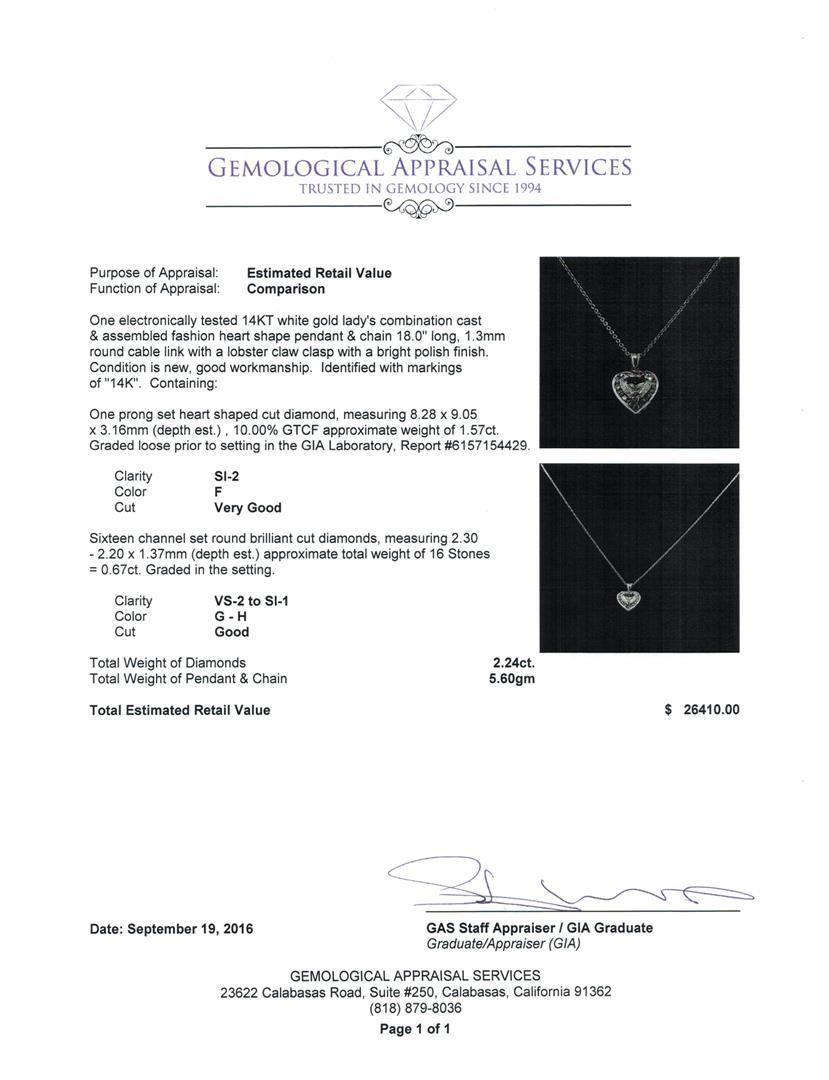 One electronically tested 14KT white gold lady's combination cast & assembled fashion heart shape pendant & chain 18.0' long, 1.3mm round cable link with a lobster claw clasp with a bright polish finish. Identified with markings of '14K'. Condition is new, good workmanship. Containing: One prong set heart shaped cut diamond, measuring 8.28 x 9.05 x 3.16mm (depth est.) , 10.00.%. GTCF approximate weight of 1.57ct. Graded loose prior to setting in the GIA Laboratory, Report #6157154429. Clarity SI-2. Color: F Cut Very Good Sixteen channel set round brilliant cut diamonds, measuring 2.30 - 2.20 x 1.37mm (depth est.) approximate total weight of 16 Stones = 0.67ct. Graded in the setting. Clarity VS-2 to SI-1. Color: G - H Cut Good. Total Weight of Diamonds 2.24ct.. Total Weight of Pendant & Chain 5.60gm. GAS Appraised.