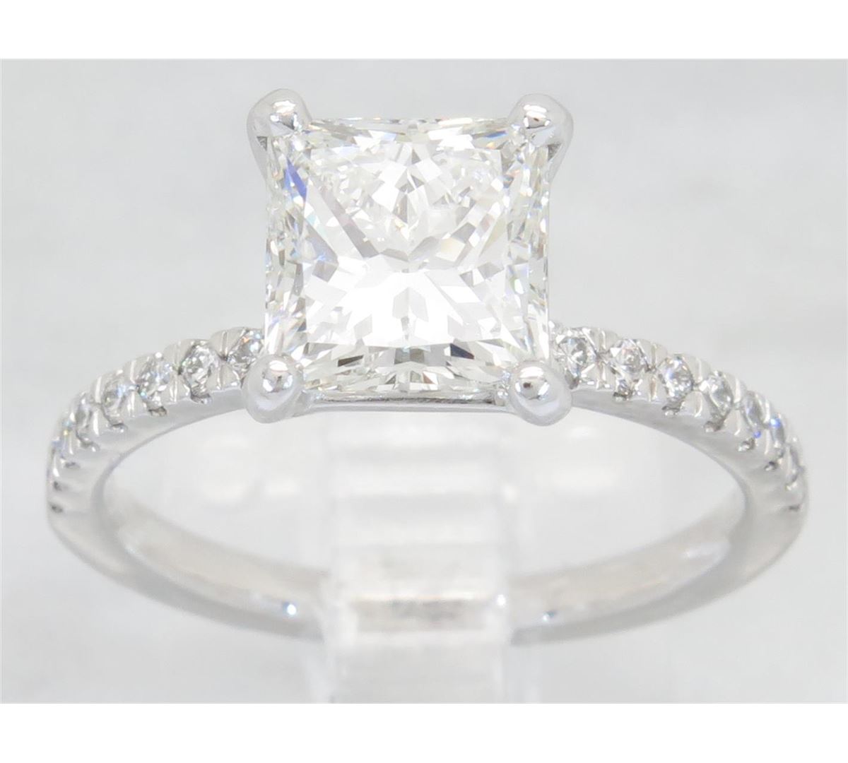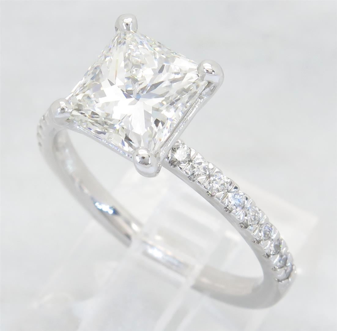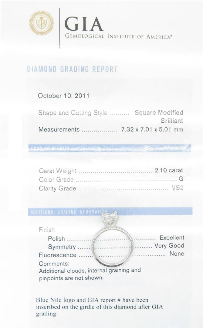 One tested platinum and diamond ring. Containing: One GIA Certified Princess Cut Diamond. Size: 2.10CT, Clarity: VS2, Color: G, Blue Nile Signature Ideal cut, polish and symmetry. 18 Round Brilliant Cut Diamonds. Approximate total diamond weight: 2.32CTW. Diamonds are graded in the mounting, unless otherwise stated. Weight: 5.2 grams. Size: 6.0. GIA Appraised.