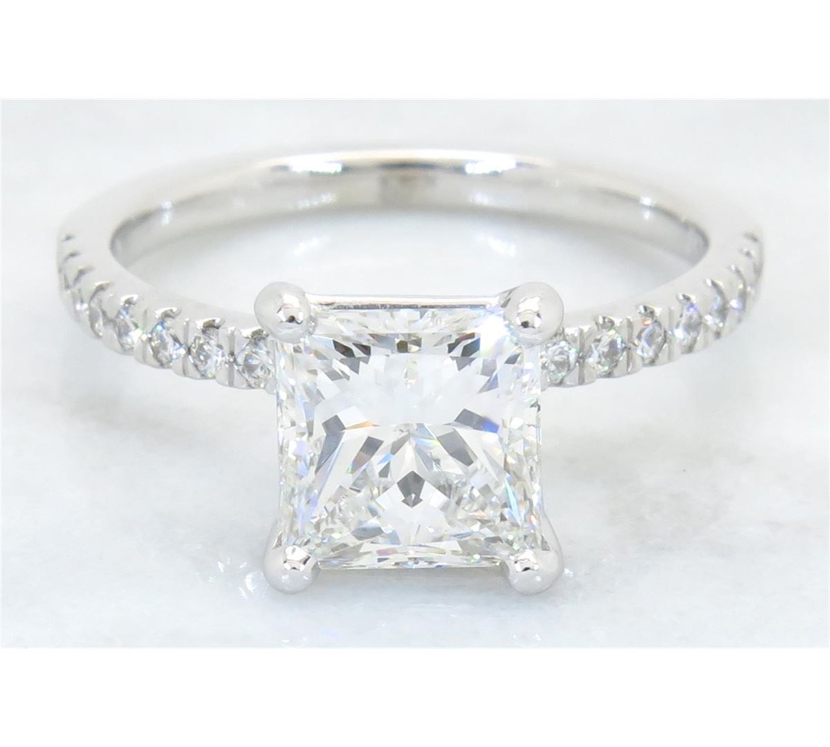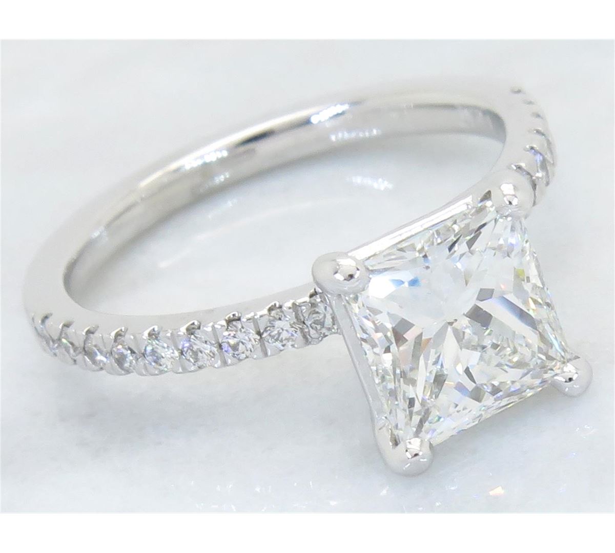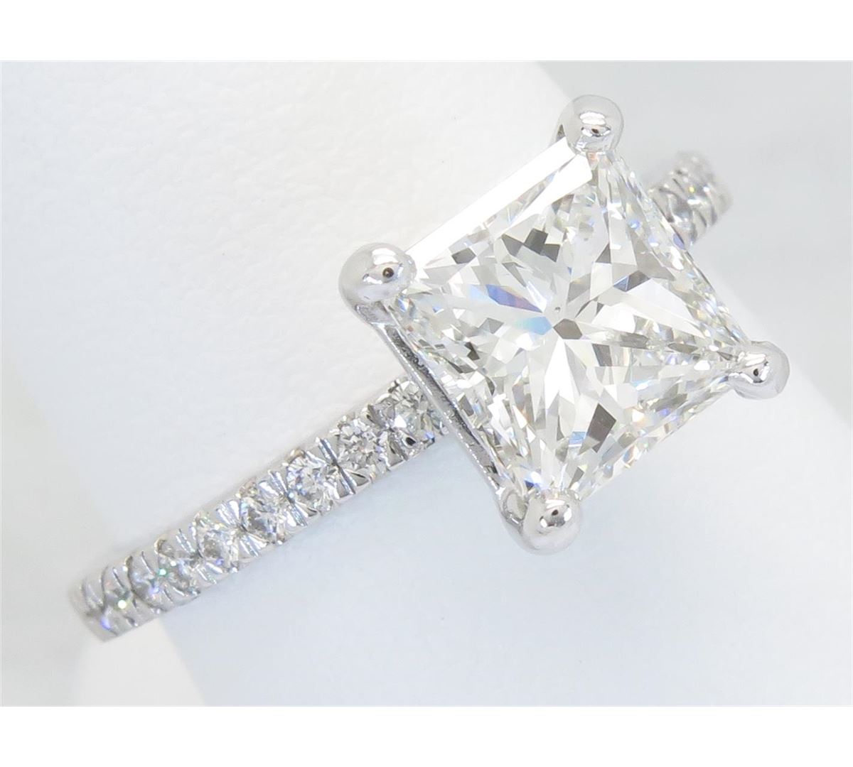 One tested platinum and diamond ring. Containing: One GIA Certified Princess Cut Diamond. Size: 2.10CT, Clarity: VS2, Color: G, Blue Nile Signature Ideal cut, polish and symmetry. 18 Round Brilliant Cut Diamonds. Approximate total diamond weight: 2.32CTW. Diamonds are graded in the mounting, unless otherwise stated. Weight: 5.2 grams. Size: 6.0. GIA Appraised.
