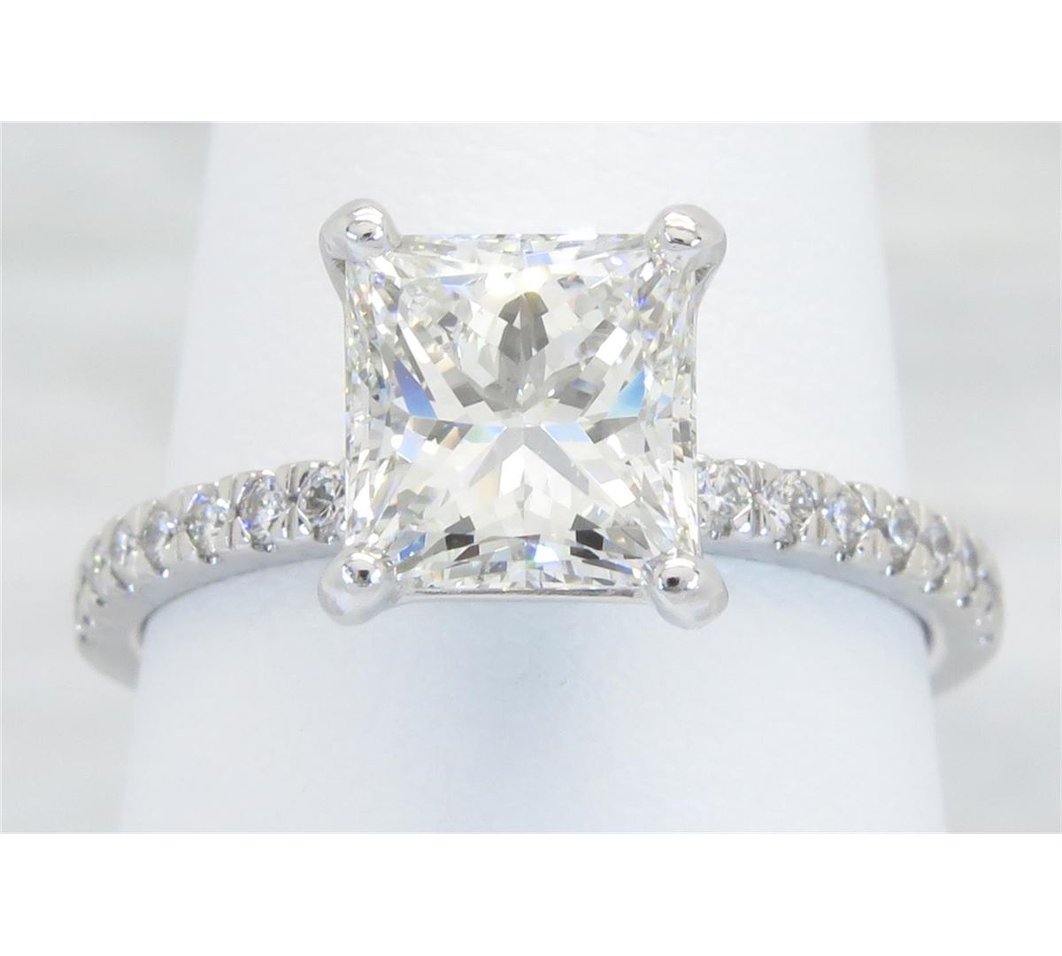 One tested platinum and diamond ring. Containing: One GIA Certified Princess Cut Diamond. Size: 2.10CT, Clarity: VS2, Color: G, Blue Nile Signature Ideal cut, polish and symmetry. 18 Round Brilliant Cut Diamonds. Approximate total diamond weight: 2.32CTW. Diamonds are graded in the mounting, unless otherwise stated. Weight: 5.2 grams. Size: 6.0. GIA Appraised.