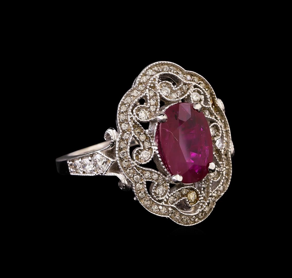 One electronically tested 14KT white gold lady's cast fashion ring with a cathedral vintage halo with a bright polish with milgrain detailing finish. The featured lady's ring has a shank measuring 1.67 millimeters in width. Identified with markings of 'K14'. Condition is new, good workmanship. Containing: One prong set oval modified step cut natural ruby, measuring 10.57 x 7.37 x 3.21mm, (depth est.) 15%. bulge factor, approximate weight of 2.53ct., clarity is moderately included, medium, moderately strong, red color, (GIA R 5/4), cut is very good. Transmitting light somewhat diffusely, transparent to translucent. Indications of laboratory high temperature heat treatment. Naturally occurring internal & external characteristics are present. Colored gemstones are presumed to have been subjected to commonly used enhancement processes. Graded loose prior to setting in the GIA Laboratory, Report #2175603135. Six prong set round brilliant cut diamonds, measuring 2.30 - 2.20 x 1.39mm (depth est.) approximate total weight of 6 Stones = 0.26ct. Graded in the setting. Clarity SI-1 to SI-2. Color: H - I Cut Good Eight prong set round brilliant cut diamonds, measuring 1.40 - 1.30 x 0.83mm (depth est.) approximate total weight of 8 Stones = 0.08ct. Graded in the setting. Clarity SI-1 to SI-2. Color: H - I Cut Good Seventy prong set round brilliant cut diamonds, measuring 1.20 - 1.15 x 0.72mm (depth est.) approximate total weight of 70 Stones = 0.42ct. Graded in the setting. Clarity SI-1 to SI-2. Color: H - I Cut Good. Total Weight of Colored Stones 2.53ct.. Total Weight of Diamonds 0.76ct.. Total Weight of Ring 7.70gm. GAS Appraised at $11,015.00.