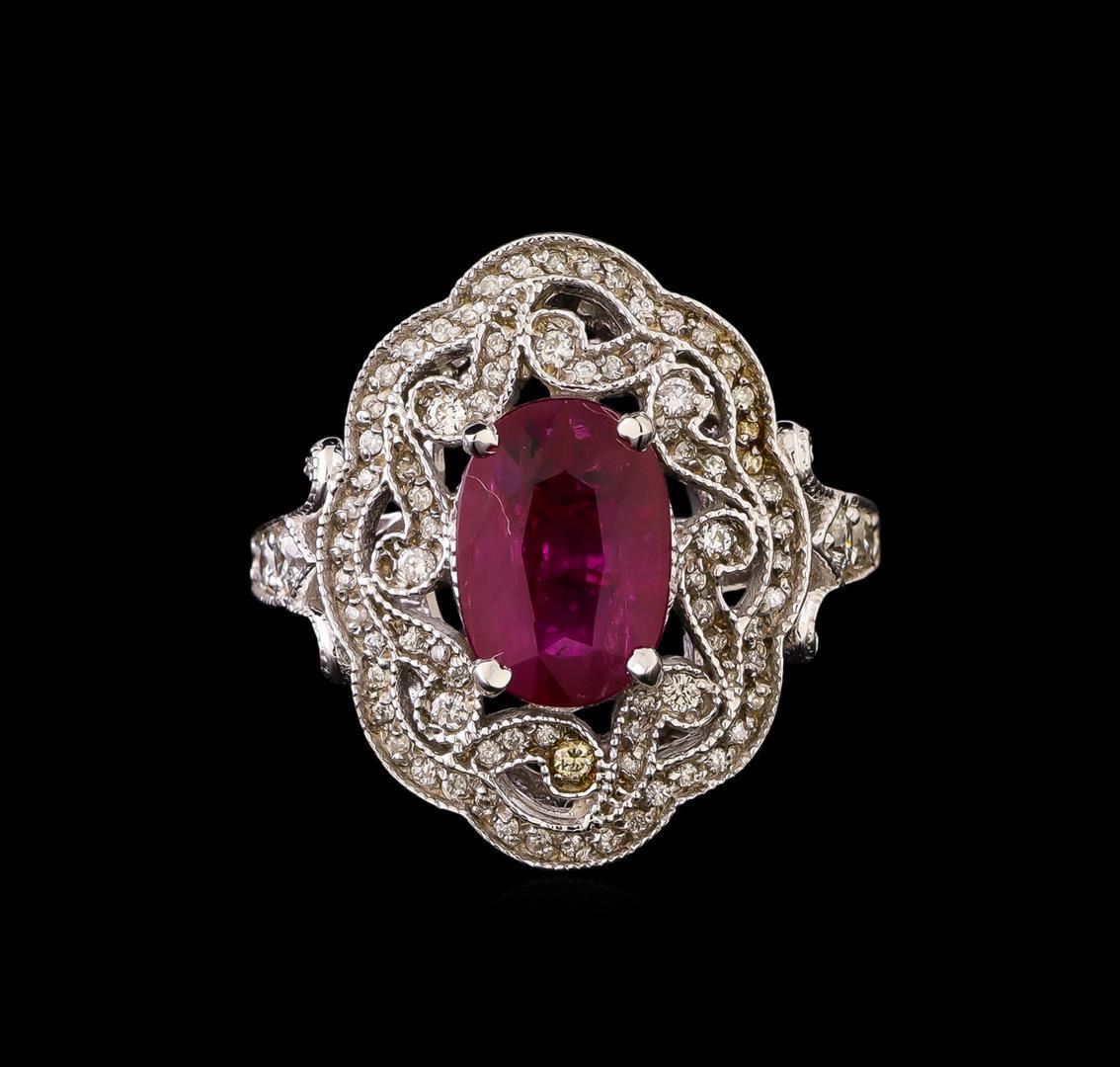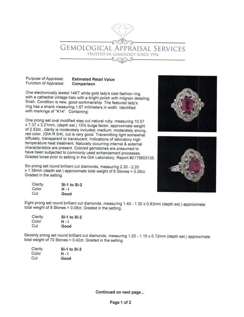 One electronically tested 14KT white gold lady's cast fashion ring with a cathedral vintage halo with a bright polish with milgrain detailing finish. The featured lady's ring has a shank measuring 1.67 millimeters in width. Identified with markings of 'K14'. Condition is new, good workmanship. Containing: One prong set oval modified step cut natural ruby, measuring 10.57 x 7.37 x 3.21mm, (depth est.) 15%. bulge factor, approximate weight of 2.53ct., clarity is moderately included, medium, moderately strong, red color, (GIA R 5/4), cut is very good. Transmitting light somewhat diffusely, transparent to translucent. Indications of laboratory high temperature heat treatment. Naturally occurring internal & external characteristics are present. Colored gemstones are presumed to have been subjected to commonly used enhancement processes. Graded loose prior to setting in the GIA Laboratory, Report #2175603135. Six prong set round brilliant cut diamonds, measuring 2.30 - 2.20 x 1.39mm (depth est.) approximate total weight of 6 Stones = 0.26ct. Graded in the setting. Clarity SI-1 to SI-2. Color: H - I Cut Good Eight prong set round brilliant cut diamonds, measuring 1.40 - 1.30 x 0.83mm (depth est.) approximate total weight of 8 Stones = 0.08ct. Graded in the setting. Clarity SI-1 to SI-2. Color: H - I Cut Good Seventy prong set round brilliant cut diamonds, measuring 1.20 - 1.15 x 0.72mm (depth est.) approximate total weight of 70 Stones = 0.42ct. Graded in the setting. Clarity SI-1 to SI-2. Color: H - I Cut Good. Total Weight of Colored Stones 2.53ct.. Total Weight of Diamonds 0.76ct.. Total Weight of Ring 7.70gm. GAS Appraised.