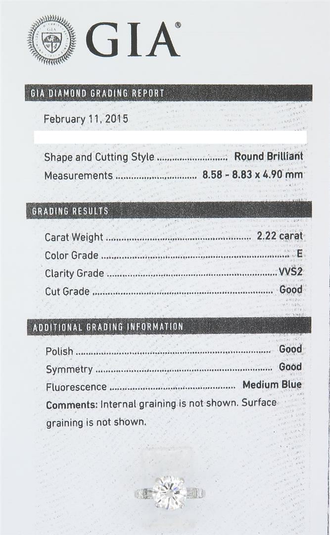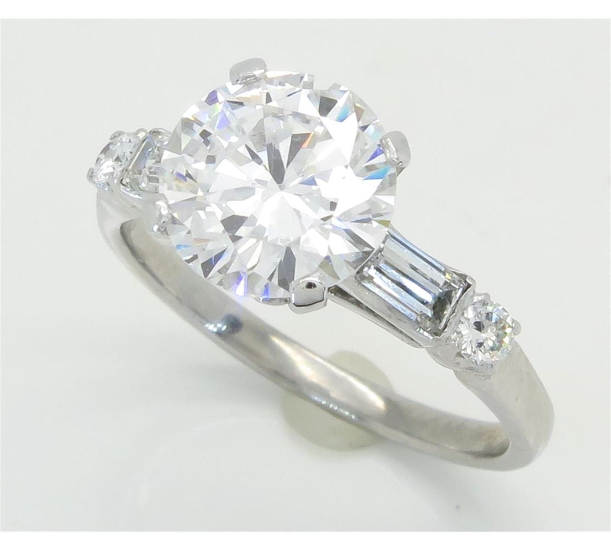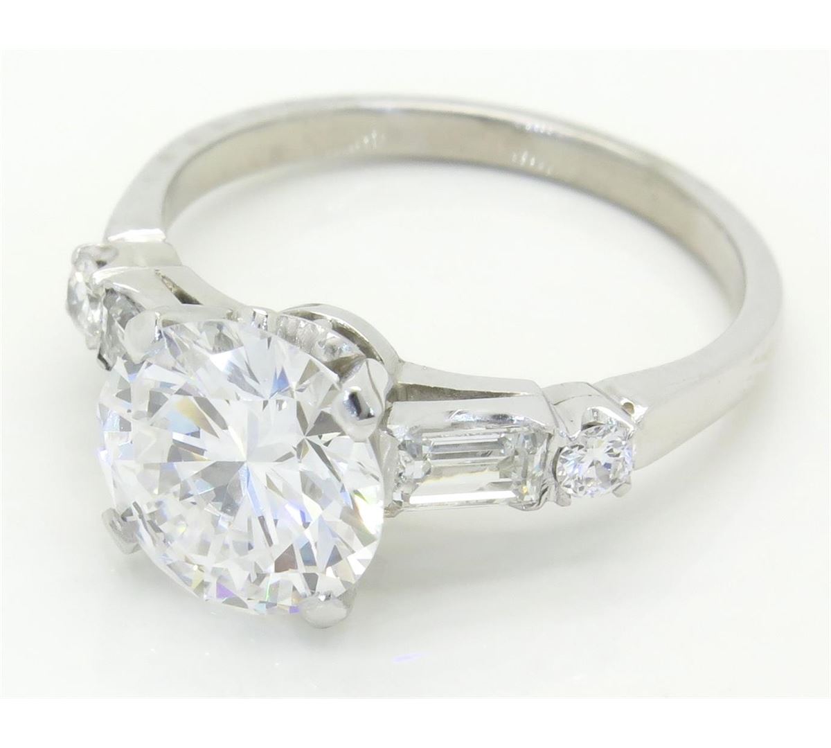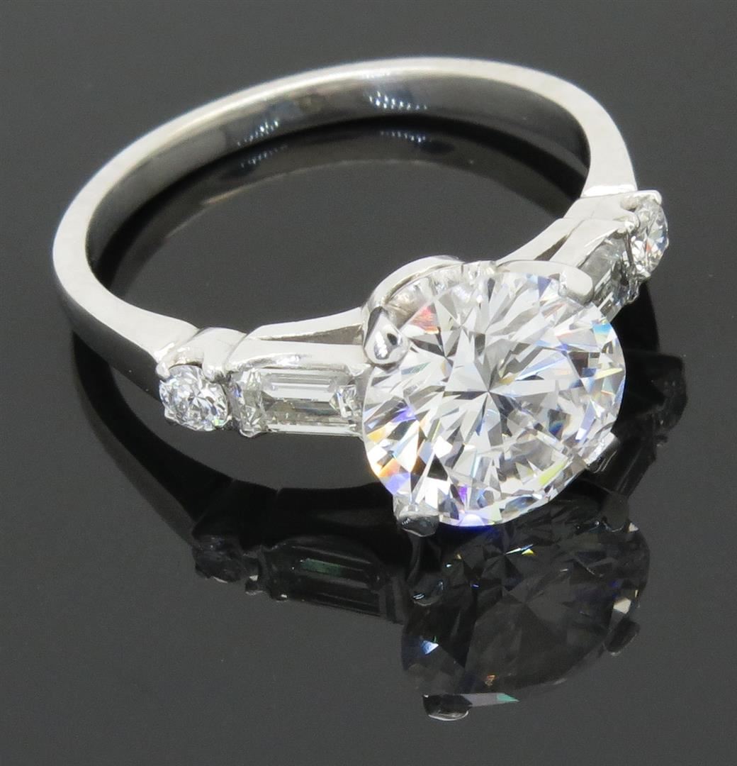 One tested platinum certified diamond ring. Containing: One GIA Certified Round Brilliant Cut Diamond. Size: 2.22CT, Clarity: VVS, Color: E. 2 Round Brilliant Cut Diamonds, 2 Baguette Cut Diamonds. Approximate Total Diamond Weight: 2.64CTW. Diamonds are graded in the mounting, unless otherwise stated. Weight: 4.7 grams. Size: 6.0 GIA Appraised.