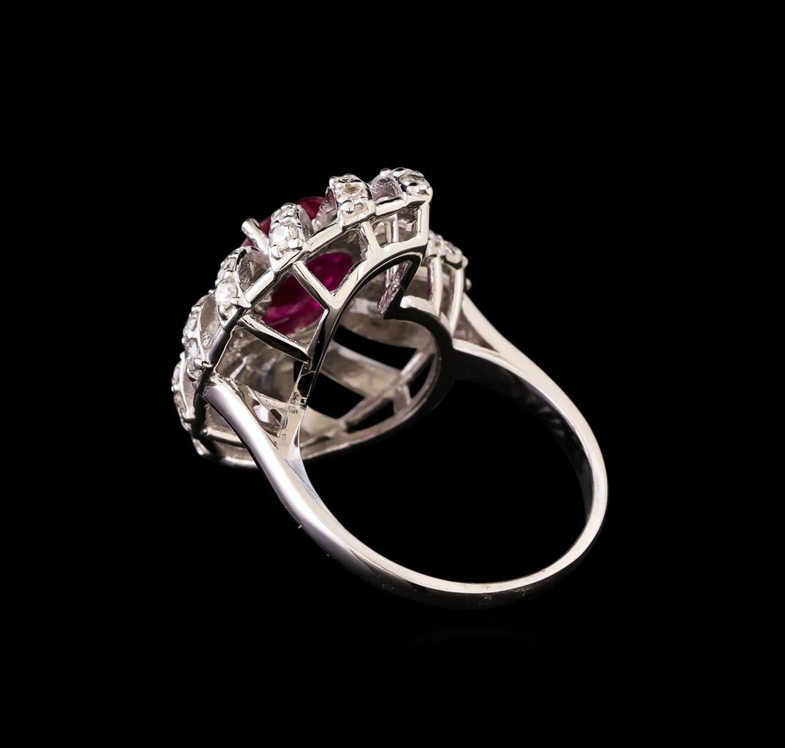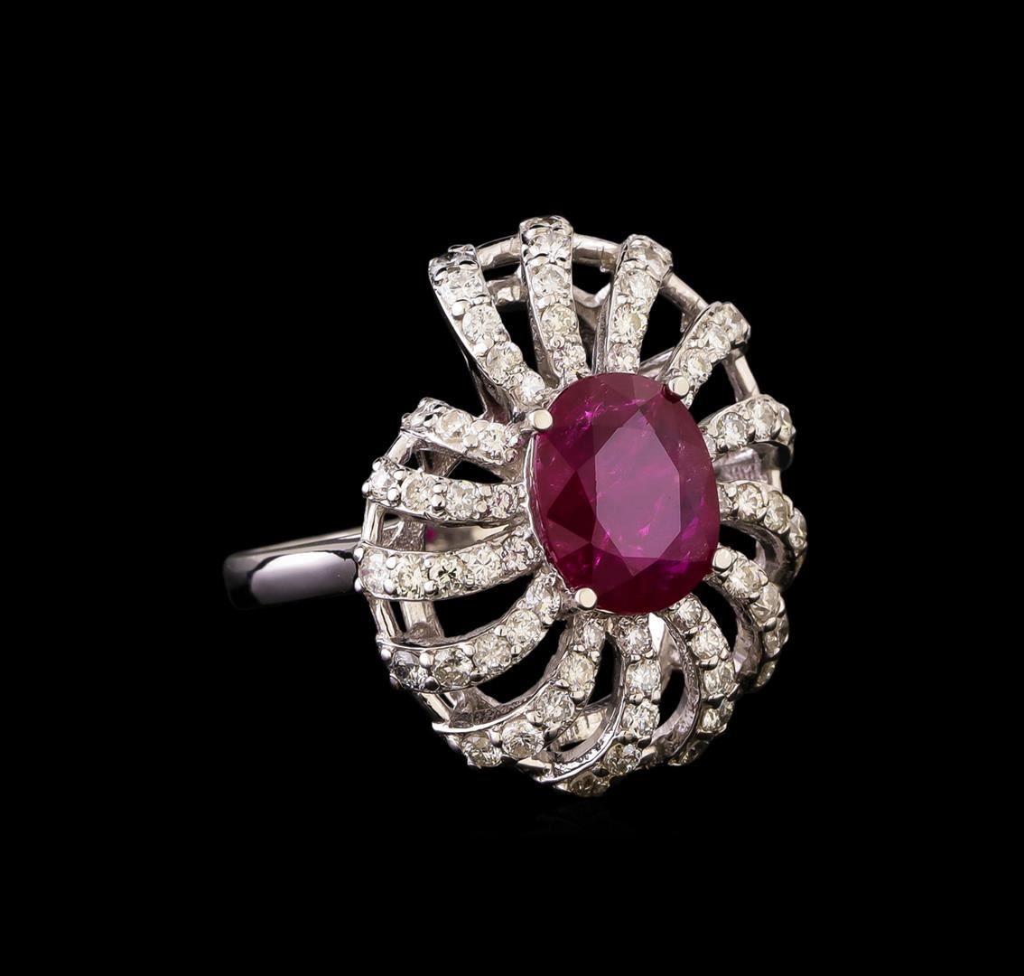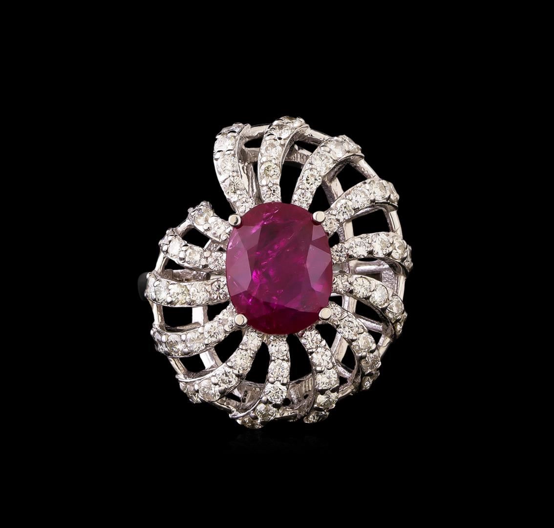 One electronically tested 14KT white gold lady's cast fashion ring with a cathedral spiral halo with a bright polish finish. The featured lady's ring has a nautical has a shank measuring 1.85 millimeters in width. Identified with markings of 'K14'. Condition is new, good workmanship. Containing: One prong set oval modified step cut natural ruby, measuring 9.86 x 7.95 x 3.85mm, (depth est.) 5%. bulge factor, approximate weight of 2.99ct., clarity is heavily included, medium, moderately strong, red color, (GIA R 5/4), cut is very good. Transmitting light somewhat diffusely, transparent to translucent. Indications of laboratory high temperature heat treatment. Naturally occurring internal & external characteristics are present. Colored gemstones are presumed to have been subjected to commonly used enhancement processes. Graded loose prior to setting in the GIA Laboratory, Report #2173603105. Twelve prong set round brilliant cut diamonds, measuring 1.90 - 1.85 x 1.17mm (depth est.) approximate total weight of 12 Stones = 0.30ct. Graded in the setting. Clarity SI-1 to I-1. Color: H - I Cut Good Forty-Two prong set round brilliant cut diamonds, measuring 1.80 - 1.65 x 1.08mm (depth est.) approximate total weight of 42 Stones = 0.78ct. Graded in the setting. Clarity SI-1 to SI-2. Color: H - I Cut Good Fourteen prong set round brilliant cut diamonds, measuring 1.55 - 1.45 x 0.92mm (depth est.) approximate total weight of 14 Stones = 0.18ct. Graded in the setting. Clarity SI-1 to SI-2. Color: H - I Cut Good. Total Weight of Colored Stones 2.99ct.. Total Weight of Diamonds 1.26ct.. Total Weight of Ring 7.40gm. GAS Appraised at $10,655.00.