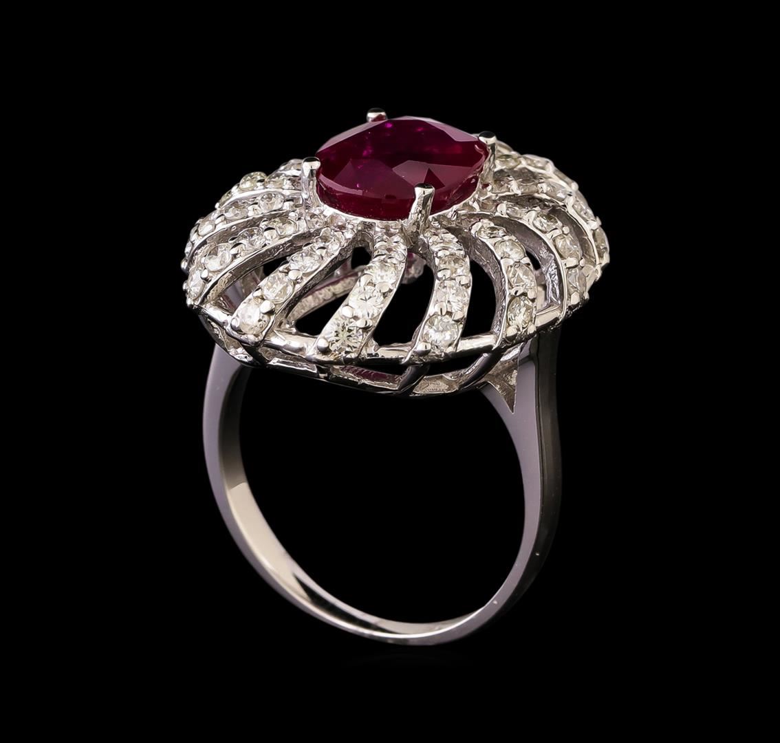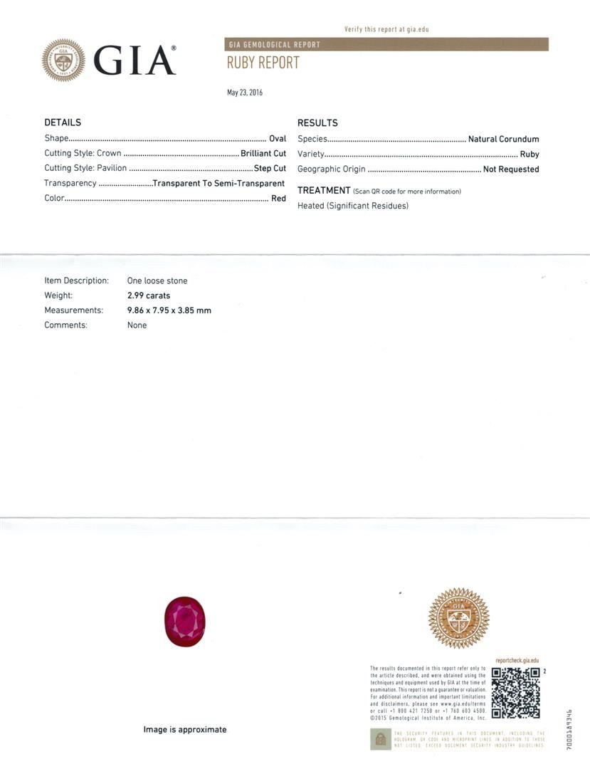 One electronically tested 14KT white gold lady's cast fashion ring with a cathedral spiral halo with a bright polish finish. The featured lady's ring has a nautical has a shank measuring 1.85 millimeters in width. Identified with markings of 'K14'. Condition is new, good workmanship. Containing: One prong set oval modified step cut natural ruby, measuring 9.86 x 7.95 x 3.85mm, (depth est.) 5%. bulge factor, approximate weight of 2.99ct., clarity is heavily included, medium, moderately strong, red color, (GIA R 5/4), cut is very good. Transmitting light somewhat diffusely, transparent to translucent. Indications of laboratory high temperature heat treatment. Naturally occurring internal & external characteristics are present. Colored gemstones are presumed to have been subjected to commonly used enhancement processes. Graded loose prior to setting in the GIA Laboratory, Report #2173603105. Twelve prong set round brilliant cut diamonds, measuring 1.90 - 1.85 x 1.17mm (depth est.) approximate total weight of 12 Stones = 0.30ct. Graded in the setting. Clarity SI-1 to I-1. Color: H - I Cut Good Forty-Two prong set round brilliant cut diamonds, measuring 1.80 - 1.65 x 1.08mm (depth est.) approximate total weight of 42 Stones = 0.78ct. Graded in the setting. Clarity SI-1 to SI-2. Color: H - I Cut Good Fourteen prong set round brilliant cut diamonds, measuring 1.55 - 1.45 x 0.92mm (depth est.) approximate total weight of 14 Stones = 0.18ct. Graded in the setting. Clarity SI-1 to SI-2. Color: H - I Cut Good. Total Weight of Colored Stones 2.99ct.. Total Weight of Diamonds 1.26ct.. Total Weight of Ring 7.40gm. GAS Appraised at $10,655.00.