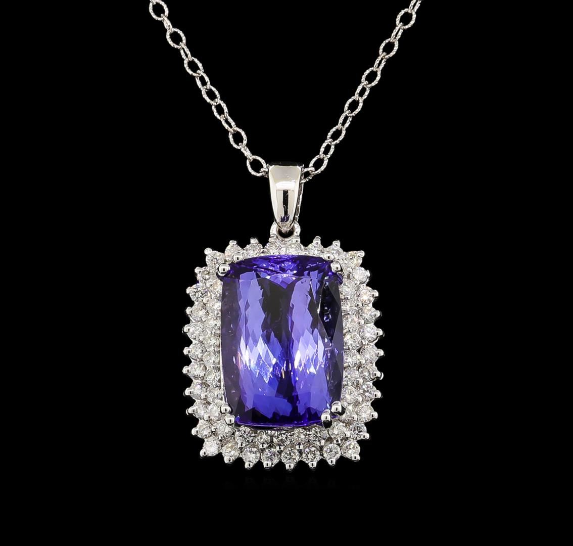One electronically tested 14KT white gold lady's combination cast & assembled fashion pendant & chain 18.0' long, 2mm twisted oval cable link with a lobster claw clasp with a double basket halo with a bright polish finish. Identified with markings of '14K'. Condition is new, good workmanship. Containing: One prong set rectangular cushion modified brilliant cut natural tanzanite, measuring 18.16 x 12.75 x 9.36mm, (depth est.) 18%. bulge factor, approximate weight of 20.21ct., clarity is eye clean, medium, moderately strong, bluish violet color, (GIA bV 5/4), cut is very good. Transmitting light with no distortion, transparent. Colored gemstones are presumed to have been subjected to commonly used enhancement processes. Graded loose prior to setting in the GIA Laboratory, Report #2175668731. Thirty-Four prong set round brilliant cut diamonds, measuring 2.00 - 1.90 x 1.21mm (depth est.) approximate total weight of 34 Stones = 0.95ct. Graded in the setting. Clarity SI-1 to I-1. Color: H - I Cut Good Thirty prong set round brilliant cut diamonds, measuring 1.85 - 1.75 x 1.12mm (depth est.) approximate total weight of 30 Stones = 0.66ct. Graded in the setting. Clarity SI-1 to SI-2. Color: H - I Cut Good. Total Weight of Colored Stones 20.21ct.. Total Weight of Diamonds 1.61ct.. Total Weight of Pendant & Chain 13.50gm. GAS Appraised at $27,945.00.