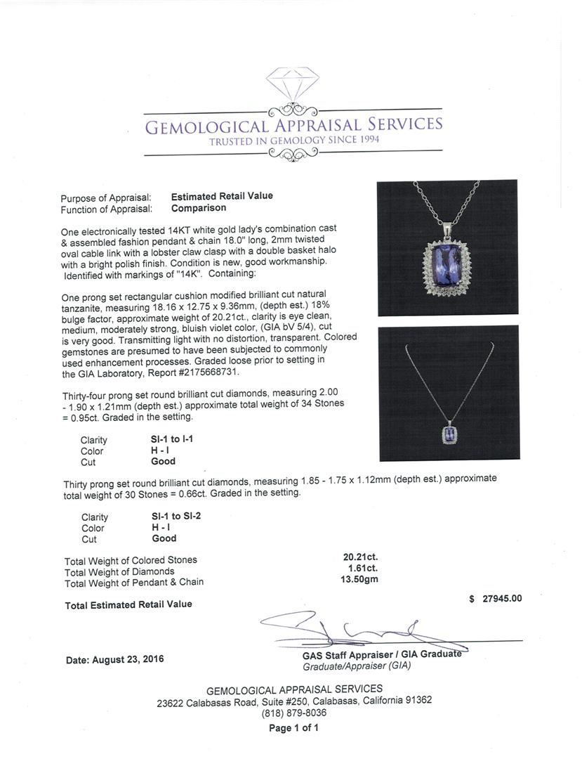 One electronically tested 14KT white gold lady's combination cast & assembled fashion pendant & chain 18.0' long, 2mm twisted oval cable link with a lobster claw clasp with a double basket halo with a bright polish finish. Identified with markings of '14K'. Condition is new, good workmanship. Containing: One prong set rectangular cushion modified brilliant cut natural tanzanite, measuring 18.16 x 12.75 x 9.36mm, (depth est.) 18%. bulge factor, approximate weight of 20.21ct., clarity is eye clean, medium, moderately strong, bluish violet color, (GIA bV 5/4), cut is very good. Transmitting light with no distortion, transparent. Colored gemstones are presumed to have been subjected to commonly used enhancement processes. Graded loose prior to setting in the GIA Laboratory, Report #2175668731. Thirty-Four prong set round brilliant cut diamonds, measuring 2.00 - 1.90 x 1.21mm (depth est.) approximate total weight of 34 Stones = 0.95ct. Graded in the setting. Clarity SI-1 to I-1. Color: H - I Cut Good Thirty prong set round brilliant cut diamonds, measuring 1.85 - 1.75 x 1.12mm (depth est.) approximate total weight of 30 Stones = 0.66ct. Graded in the setting. Clarity SI-1 to SI-2. Color: H - I Cut Good. Total Weight of Colored Stones 20.21ct.. Total Weight of Diamonds 1.61ct.. Total Weight of Pendant & Chain 13.50gm. GAS Appraised at $27,945.00.