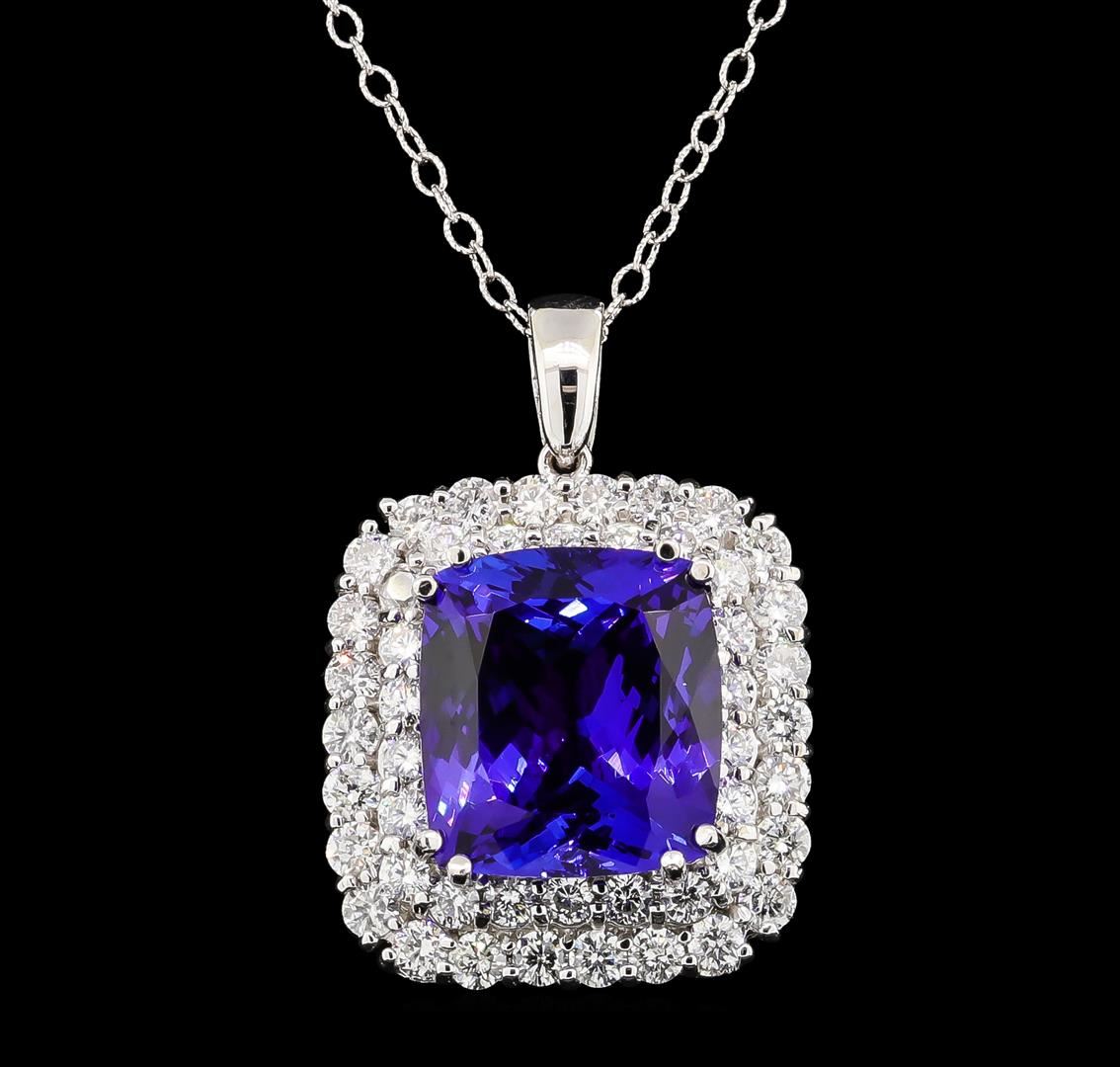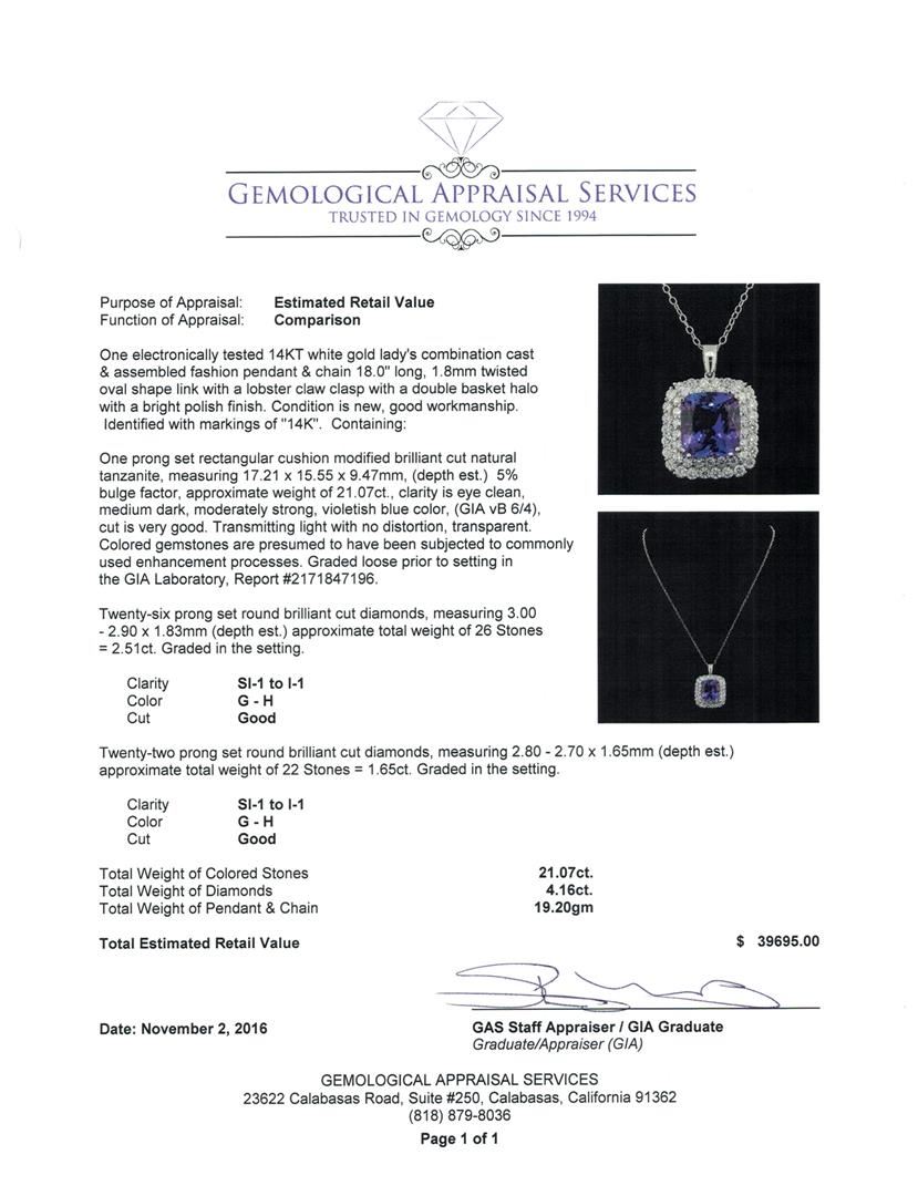 One electronically tested 14KT white gold lady's combination cast & assembled fashion pendant & chain 18.0' long, 1.8mm twisted oval shape link with a lobster claw clasp with a double basket halo with a bright polish finish. Identified with markings of '14K'. Condition is new, good workmanship. Containing: One prong set rectangular cushion modified brilliant cut natural tanzanite, measuring 17.21 x 15.55 x 9.47mm, (depth est.) 5%. bulge factor, approximate weight of 21.07ct., clarity is eye clean, medium dark, moderately strong, violetish blue color, (GIA vB 6/4), cut is very good. Transmitting light with no distortion, transparent. Colored gemstones are presumed to have been subjected to commonly used enhancement processes. Graded loose prior to setting in the GIA Laboratory, Report #2171847196. Twenty-Six prong set round brilliant cut diamonds, measuring 3.00 - 2.90 x 1.83mm (depth est.) approximate total weight of 26 Stones = 2.51ct. Graded in the setting. Clarity SI-1 to I-1. Color: G - H Cut Good Twenty-Two prong set round brilliant cut diamonds, measuring 2.80 - 2.70 x 1.65mm (depth est.) approximate total weight of 22 Stones = 1.65ct. Graded in the setting. Clarity SI-1 to I-1. Color: G - H Cut Good. Total Weight of Colored Stones 21.07ct.. Total Weight of Diamonds 4.16ct.. Total Weight of Pendant & Chain 19.20gm. GAS Appraised at $39,695.00.
