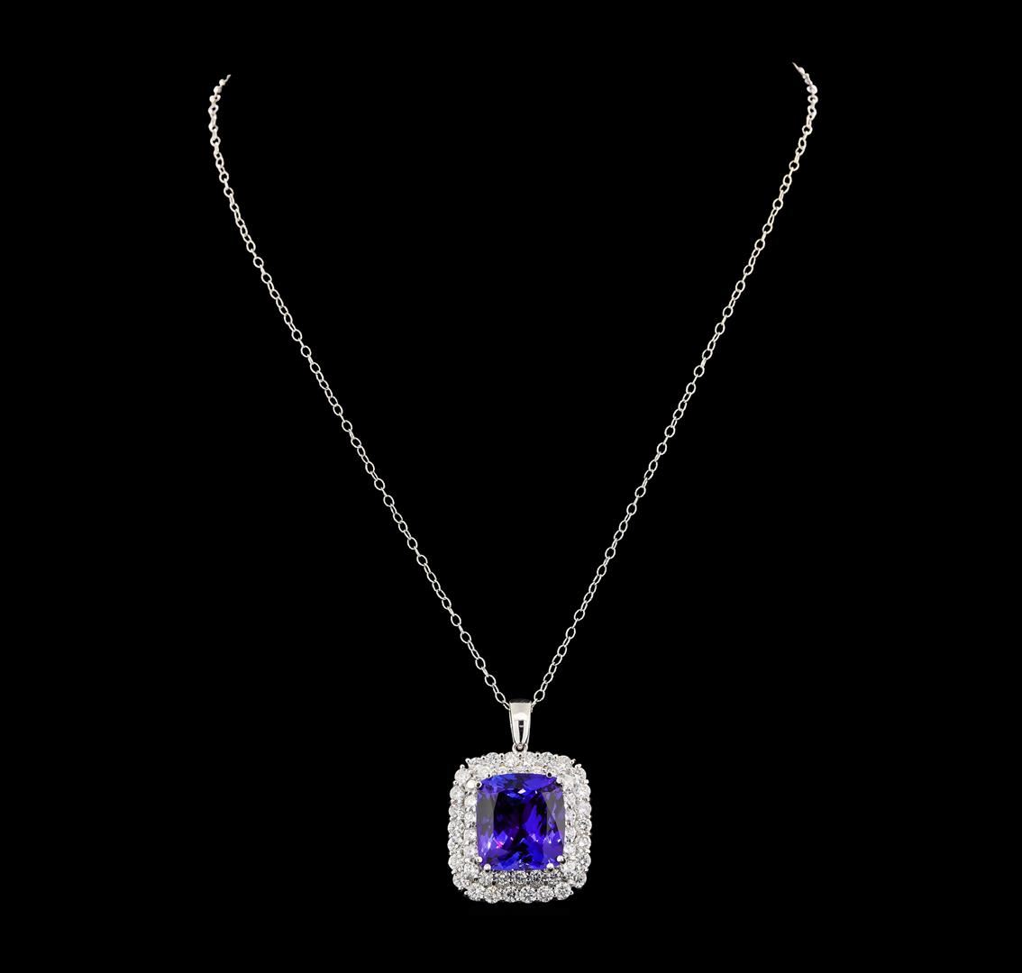 One electronically tested 14KT white gold lady's combination cast & assembled fashion pendant & chain 18.0' long, 1.8mm twisted oval shape link with a lobster claw clasp with a double basket halo with a bright polish finish. Identified with markings of '14K'. Condition is new, good workmanship. Containing: One prong set rectangular cushion modified brilliant cut natural tanzanite, measuring 17.21 x 15.55 x 9.47mm, (depth est.) 5%. bulge factor, approximate weight of 21.07ct., clarity is eye clean, medium dark, moderately strong, violetish blue color, (GIA vB 6/4), cut is very good. Transmitting light with no distortion, transparent. Colored gemstones are presumed to have been subjected to commonly used enhancement processes. Graded loose prior to setting in the GIA Laboratory, Report #2171847196. Twenty-Six prong set round brilliant cut diamonds, measuring 3.00 - 2.90 x 1.83mm (depth est.) approximate total weight of 26 Stones = 2.51ct. Graded in the setting. Clarity SI-1 to I-1. Color: G - H Cut Good Twenty-Two prong set round brilliant cut diamonds, measuring 2.80 - 2.70 x 1.65mm (depth est.) approximate total weight of 22 Stones = 1.65ct. Graded in the setting. Clarity SI-1 to I-1. Color: G - H Cut Good. Total Weight of Colored Stones 21.07ct.. Total Weight of Diamonds 4.16ct.. Total Weight of Pendant & Chain 19.20gm. GAS Appraised at $39,695.00.