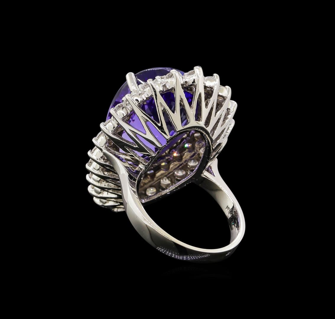 One electronically tested 14KT white gold lady's cast fashion ring with a double basket halo with a bright polish finish. The featured lady's ring has a shank measuring 3.26 millimeters wide. Identified with markings of 'K14'. Condition is new, good workmanship. Containing: One prong set pear modified brilliant cut natural tanzanite, measuring 20.86 x 14.13 x 11.90mm, (depth est.) approximate weight of 21.32ct., clarity is eye clean, medium dark, strong, violet color, (GIA V 6/5), cut is very good. Transmitting light with no distortion, transparent. Colored gemstones are presumed to have been subjected to commonly used enhancement processes. Graded loose prior to setting in the GIA Laboratory, Report #1172668639. Twenty-Four prong set round brilliant cut diamonds, measuring 2.80 - 2.70 x 1.71mm (depth est.) approximate total weight of 24 Stones = 1.94ct. Graded in the setting. Clarity SI-1 to I-1. Color: H - I Cut Good Twenty-Three prong set round brilliant cut diamonds, measuring 2.40 - 2.30 x 1.46mm (depth est.) approximate total weight of 23 Stones = 1.13ct. Graded in the setting. Clarity SI-1 to I-1. Color: G - I Cut Good. Total Weight of Colored Stones 21.32ct.. Total Weight of Diamonds 3.07ct.. Total Weight of Ring 16.50gm. GAS Appraised at $32,790.00.