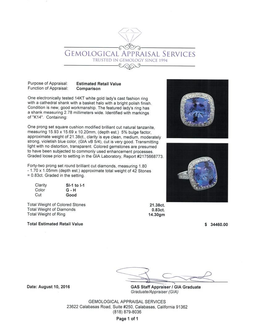 One electronically tested 14KT white gold lady's cast fashion ring with a cathedral shank with a basket halo with a bright polish finish. The featured lady's ring has a shank measuring 2.78 millimeters wide. Identified with markings of 'K14'. Condition is new, good workmanship. Containing: One prong set square cushion modified brilliant cut natural tanzanite, measuring 15.93 x 15.69 x 10.20mm, (depth est.) 5%. bulge factor, approximate weight of 21.38ct., clarity is eye clean, medium, moderately strong, violetish blue color, (GIA vB 5/4), cut is very good. Transmitting light with no distortion, transparent. Colored gemstones are presumed to have been subjected to commonly used enhancement processes. Graded loose prior to setting in the GIA Laboratory, Report #2175668773. Forty-Two prong set round brilliant cut diamonds, measuring 1.80 - 1.70 x 1.05mm (depth est.) approximate total weight of 42 Stones = 0.83ct. Graded in the setting. Clarity SI-1 to I-1. Color: G - H Cut Good. Total Weight of Colored Stones 21.38ct.. Total Weight of Diamonds 0.83ct.. Total Weight of Ring 14.30gm. GAS Appraised at $34,460.00.