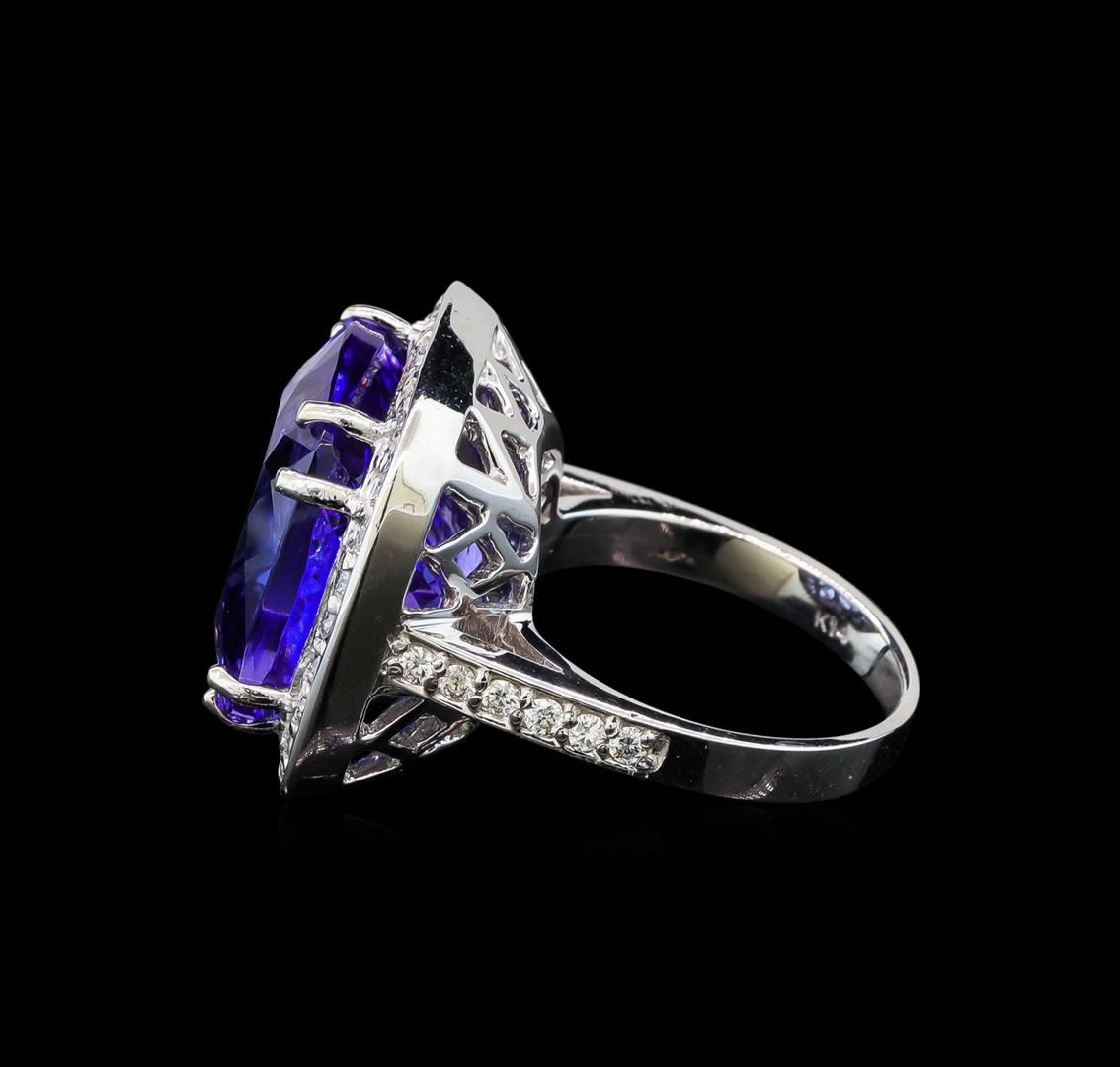 One electronically tested 14KT white gold lady's cast fashion ring with a cathedral shank with a basket halo with a bright polish finish. The featured lady's ring has a shank measuring 2.78 millimeters wide. Identified with markings of 'K14'. Condition is new, good workmanship. Containing: One prong set square cushion modified brilliant cut natural tanzanite, measuring 15.93 x 15.69 x 10.20mm, (depth est.) 5%. bulge factor, approximate weight of 21.38ct., clarity is eye clean, medium, moderately strong, violetish blue color, (GIA vB 5/4), cut is very good. Transmitting light with no distortion, transparent. Colored gemstones are presumed to have been subjected to commonly used enhancement processes. Graded loose prior to setting in the GIA Laboratory, Report #2175668773. Forty-Two prong set round brilliant cut diamonds, measuring 1.80 - 1.70 x 1.05mm (depth est.) approximate total weight of 42 Stones = 0.83ct. Graded in the setting. Clarity SI-1 to I-1. Color: G - H Cut Good. Total Weight of Colored Stones 21.38ct.. Total Weight of Diamonds 0.83ct.. Total Weight of Ring 14.30gm. GAS Appraised at $34,460.00.