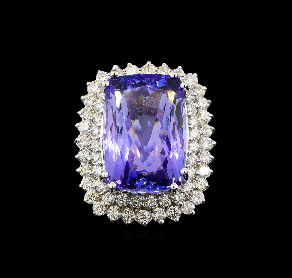 One electronically tested 14KT white gold lady's cast fashion ring with a double basket halo with a bright polish finish. The featured lady's ring has a shank measuring 2.94 millimeters wide. Identified with markings of 'K14'. Condition is new, good workmanship. Containing: One prong set rectangular cushion modified brilliant cut natural tanzanite, measuring 19.52 x 13.46 x 8.34mm, (depth est.) 25%. bulge factor, approximate weight of 21.48ct., clarity is eye clean, medium light, moderately strong, violet color, (GIA V 4/4), cut is very good. Transmitting light with no distortion, transparent. Colored gemstones are presumed to have been subjected to commonly used enhancement processes. Graded loose prior to setting in the GIA Laboratory, Report #2175668706. Thirty-Two prong set round brilliant cut diamonds, measuring 2.40 - 2.30 x 1.46mm (depth est.) approximate total weight of 32 Stones = 1.56ct. Graded in the setting. Clarity SI-1 to I-1. Color: H - I Cut Good Twenty-Eight prong set round brilliant cut diamonds, measuring 2.10 - 2.00 x 1.23mm (depth est.) approximate total weight of 28 Stones = 0.88ct. Graded in the setting. Clarity SI-1 to SI-2. Color: G - H Cut Good. Total Weight of Colored Stones 21.48ct.. Total Weight of Diamonds 2.44ct.. Total Weight of Ring 14.70gm. GAS Appraised at $29,840.00.
