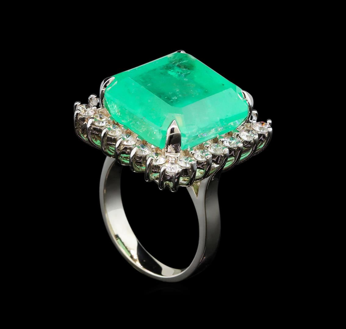 One electronically tested 14KT white gold lady's cast fashion ring with a basket halo with a bright polish finish. The featured lady's ring has a shank measuring 3.20 millimeters wide. Identified with markings of 'K14'. Condition is new, good workmanship. Containing: One prong set emerald standard step cut natural emerald, measuring 16.35 x 16.02 x 10.59mm, (depth est.) 7%. bulge factor, approximate weight of 21.72ct., clarity is heavily included, medium light, moderately strong, green color, (GIA G 4/4), cut is very good. Transmitting light somewhat diffusely, semi-transparent to translucent. Naturally occurring internal & external characteristics are present. Indications of oil residue. Clarity enhanced. Colored gemstones are presumed to have been subjected to commonly used enhancement processes. Graded loose prior to setting in the GIA Laboratory, Report #5171668600. Twenty-Four prong set round brilliant cut diamonds, measuring 2.60 - 2.55 x 1.60mm (depth est.) approximate total weight of 24 Stones = 1.57ct. Graded in the setting. Clarity SI-1 to I-1. Color: H - I Cut Good. Total Weight of Colored Stones 21.72ct.. Total Weight of Diamonds 1.57ct.. Total Weight of Ring 12.30gm. GAS Appraised at $22,405.00.