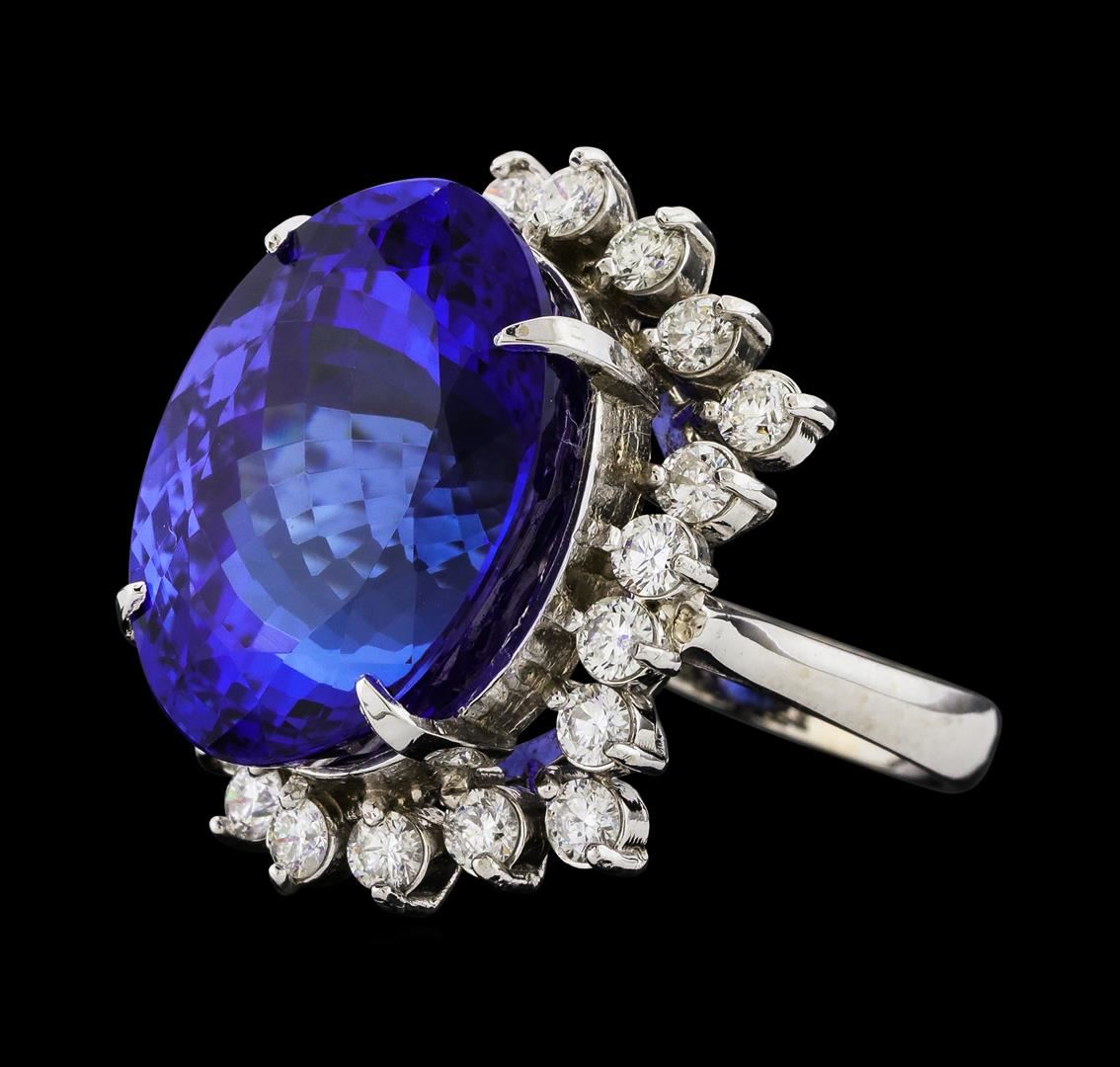 One electronically tested 14KT white gold lady's cast fashion ring with a staggered basket halo with a bright polish finish. The featured lady's ring has a shank measuring 3.28 millimeters wide. Identified with markings of 'K14'. Condition is new, good workmanship. Containing: One prong set oval modified brilliant cut natural tanzanite, measuring 18.81 x 14.11 x 11.62mm, (depth est.) 3%. bulge factor, approximate weight of 22.45ct., clarity is eye clean, dark, strong, violetish blue color, (GIA vB 7/5), cut is very good. Transmitting light with no distortion, transparent. Colored gemstones are presumed to have been subjected to commonly used enhancement processes. Graded loose prior to setting in the GIA Laboratory, Report #5171847716. Twenty-Two prong set round brilliant cut diamonds, measuring 2.60 - 2.50 x 1.56mm (depth est.) approximate total weight of 22 Stones = 1.35ct. Graded in the setting. Clarity SI-1 to SI-2. Color: H - I Cut Good. Total Weight of Colored Stones 22.45ct.. Total Weight of Diamonds 1.35ct.. Total Weight of Ring 11.60gm. GAS Appraised at $32,570.00.