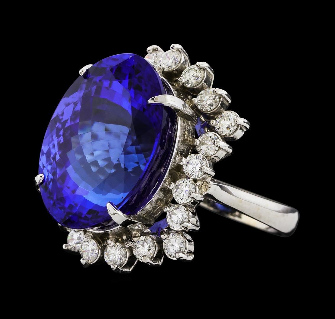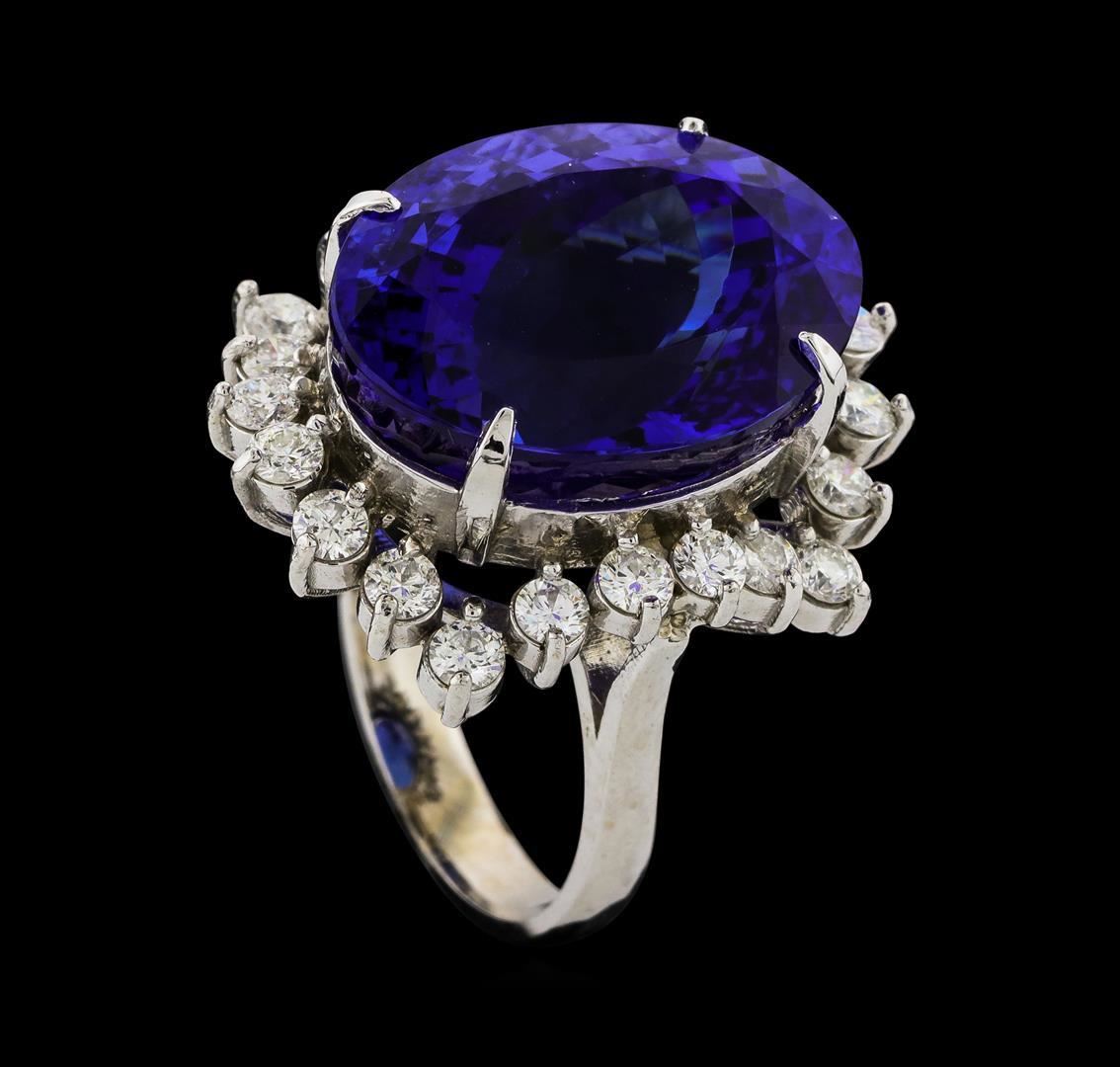 One electronically tested 14KT white gold lady's cast fashion ring with a staggered basket halo with a bright polish finish. The featured lady's ring has a shank measuring 3.28 millimeters wide. Identified with markings of 'K14'. Condition is new, good workmanship. Containing: One prong set oval modified brilliant cut natural tanzanite, measuring 18.81 x 14.11 x 11.62mm, (depth est.) 3%. bulge factor, approximate weight of 22.45ct., clarity is eye clean, dark, strong, violetish blue color, (GIA vB 7/5), cut is very good. Transmitting light with no distortion, transparent. Colored gemstones are presumed to have been subjected to commonly used enhancement processes. Graded loose prior to setting in the GIA Laboratory, Report #5171847716. Twenty-Two prong set round brilliant cut diamonds, measuring 2.60 - 2.50 x 1.56mm (depth est.) approximate total weight of 22 Stones = 1.35ct. Graded in the setting. Clarity SI-1 to SI-2. Color: H - I Cut Good. Total Weight of Colored Stones 22.45ct.. Total Weight of Diamonds 1.35ct.. Total Weight of Ring 11.60gm. GAS Appraised.